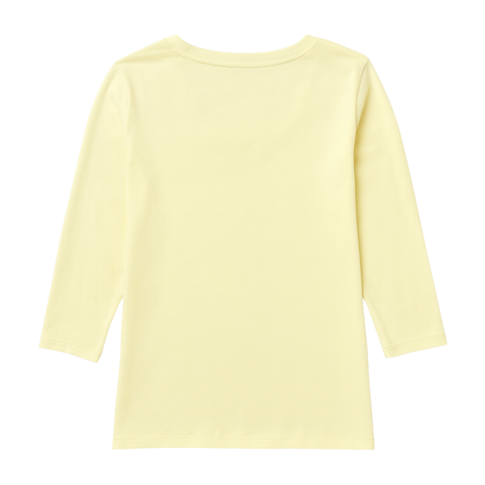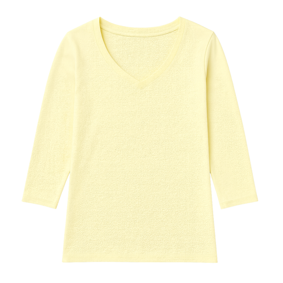 เสื้อยืดผู้หญิงสีเหลือง แขน 3/4 คอวี ผ้าฝ้ายออร์แกนิค 100% เป็นมิตรกับสิ่งแวดล้อม ผ่านการซักแล้ว ได้รับการรับรองมาตรฐาน GOTS เนื้อผ้านุ่ม ระบายอากาศได้ดี