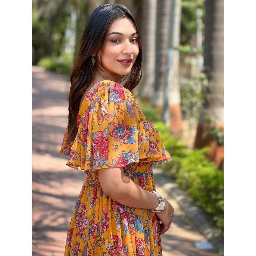 เดรสยาวพิมพ์ลายดอกไม้สีเหลืองสำหรับผู้หญิง คอวี แขนสั้น ทรงบาน