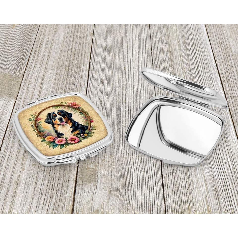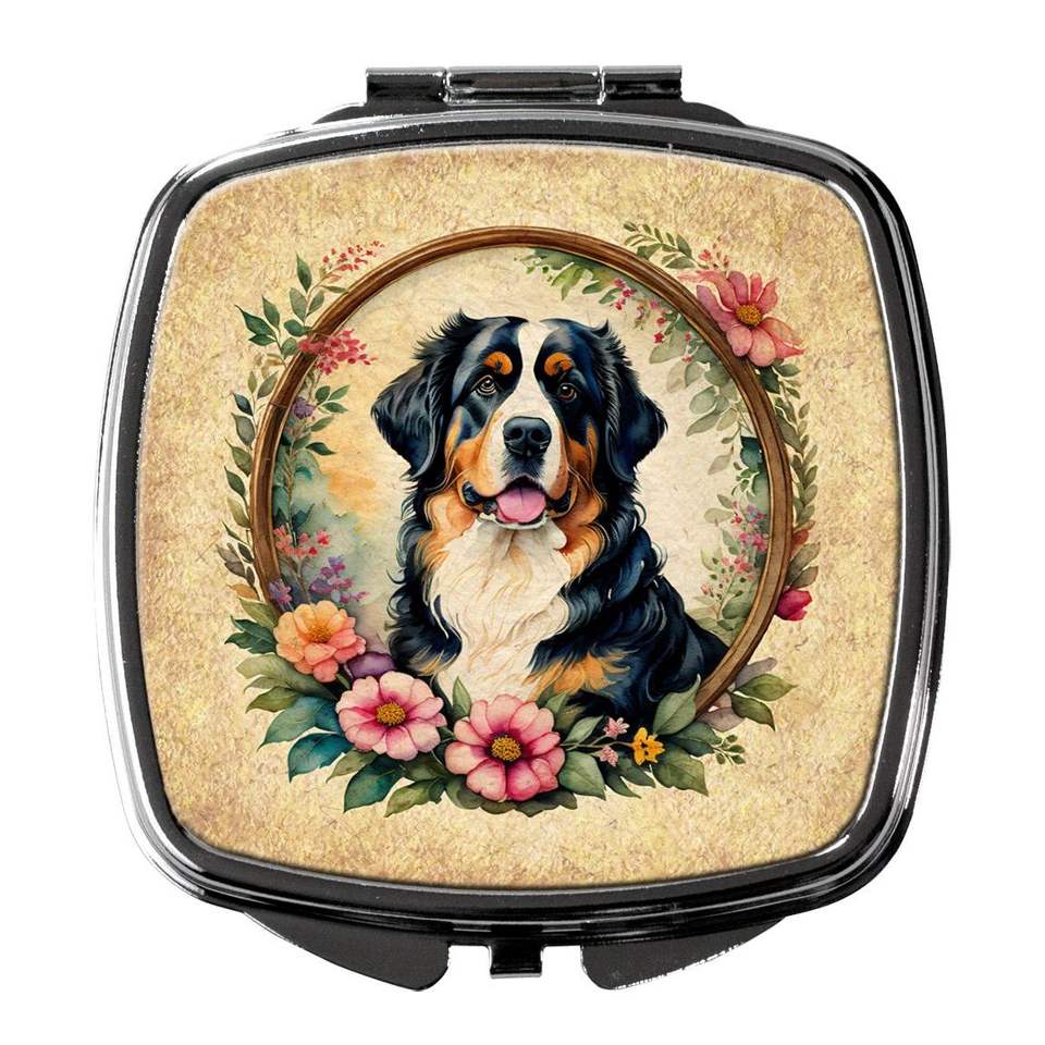 กระจกแต่งหน้าพับได้ลายดอกไม้สำหรับสุนัขภูเขาเบอร์นีสขนาดกะทัดรัดสำหรับผู้หญิงและผู้หญิงของขวัญดีไซน์มือถือ