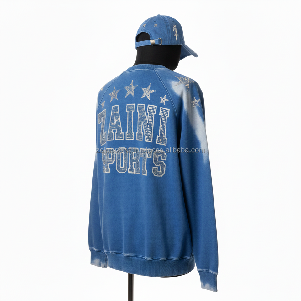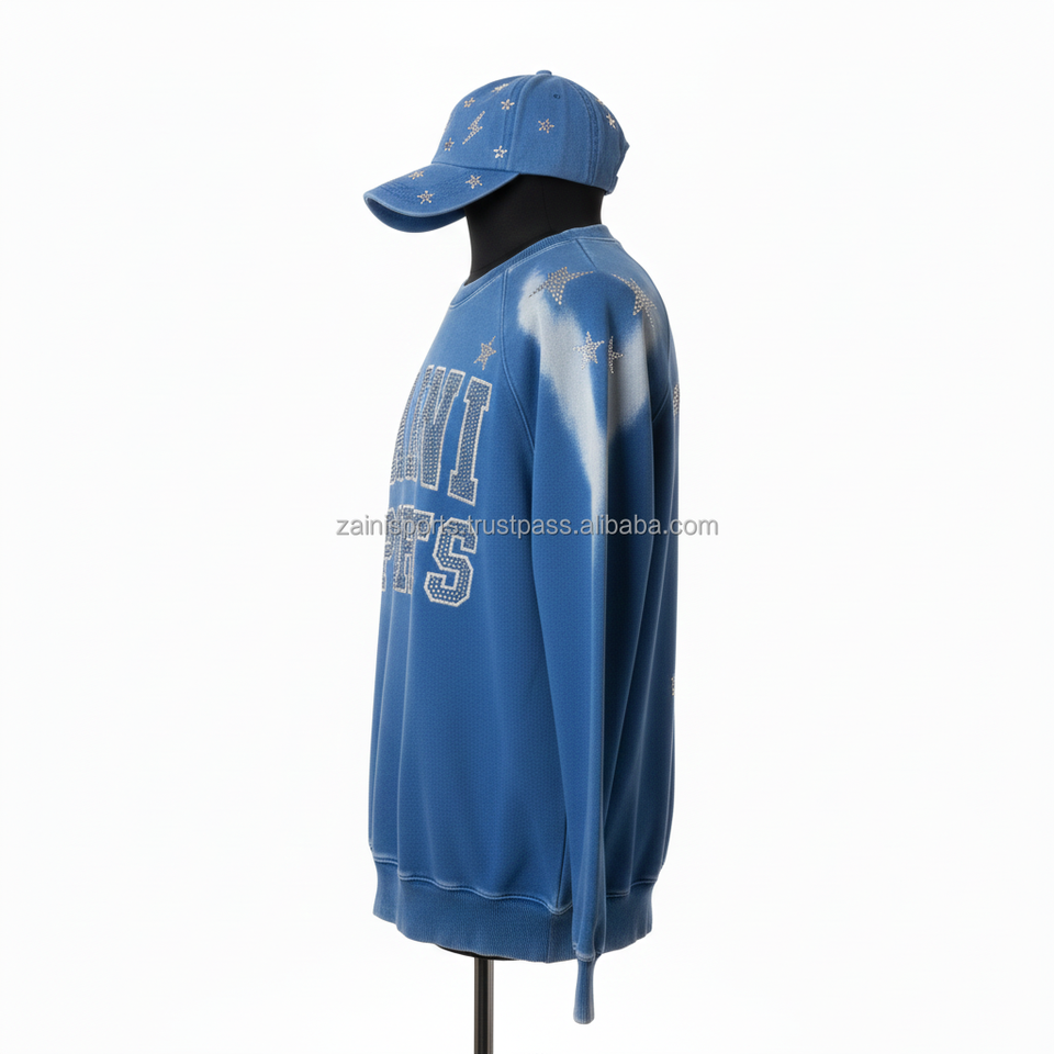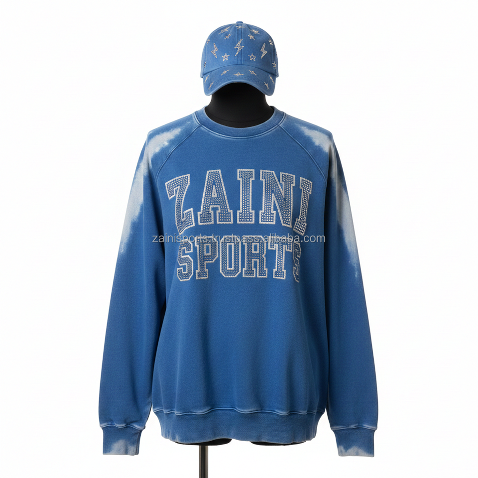 เสื้อสเวตเชิ้ตผ้าฝ้ายฟลีซสำหรับผู้หญิง สีน้ำเงินลายมัดย้อมที่แขนเสื้อ ประดับคริสตัล โลโก้สั่งทำได้ เนื้อผ้านุ่ม อุ่น สไตล์ลำลอง ระบายอากาศได้ดี