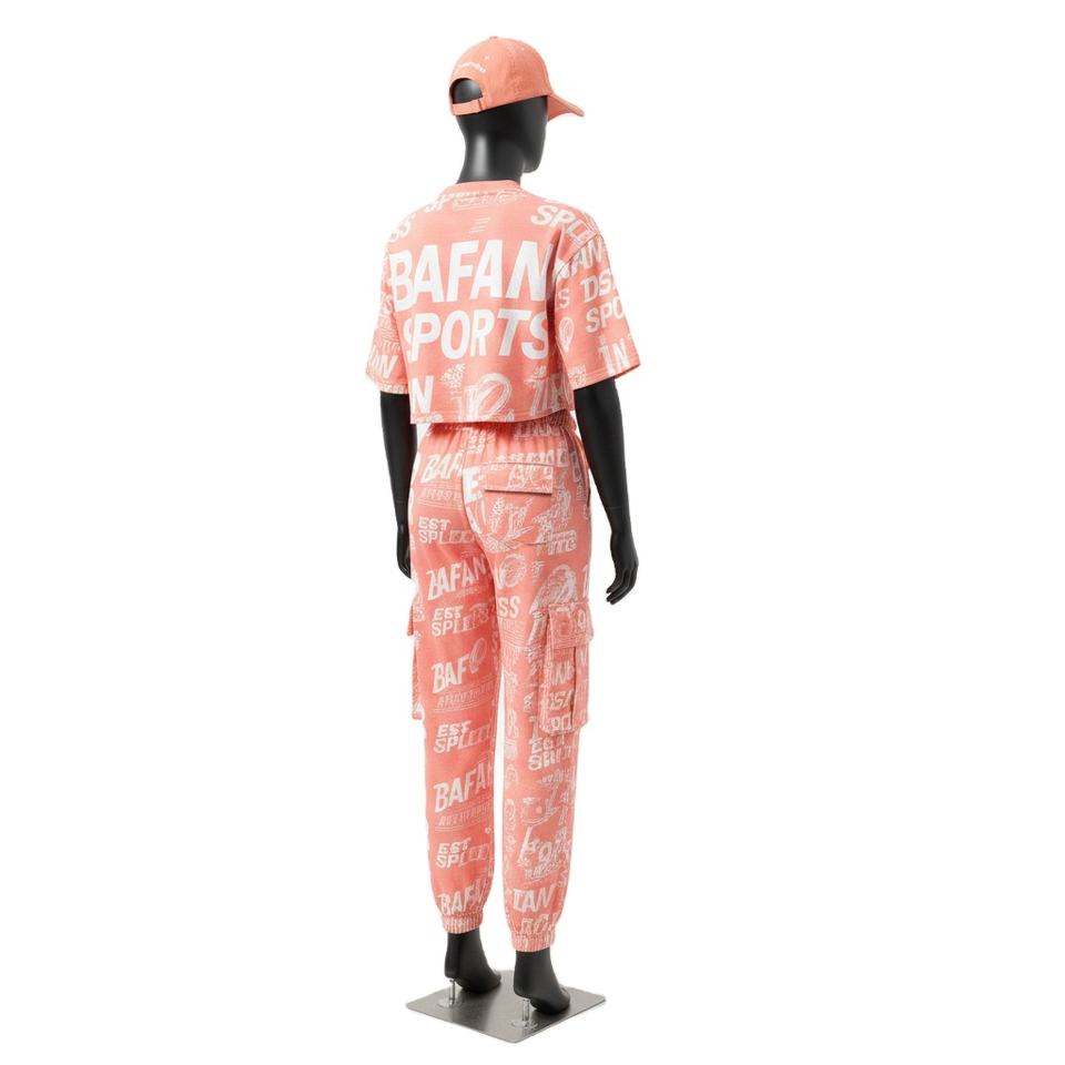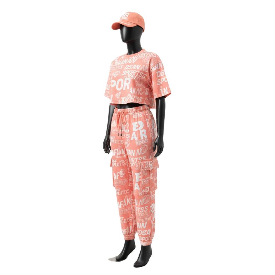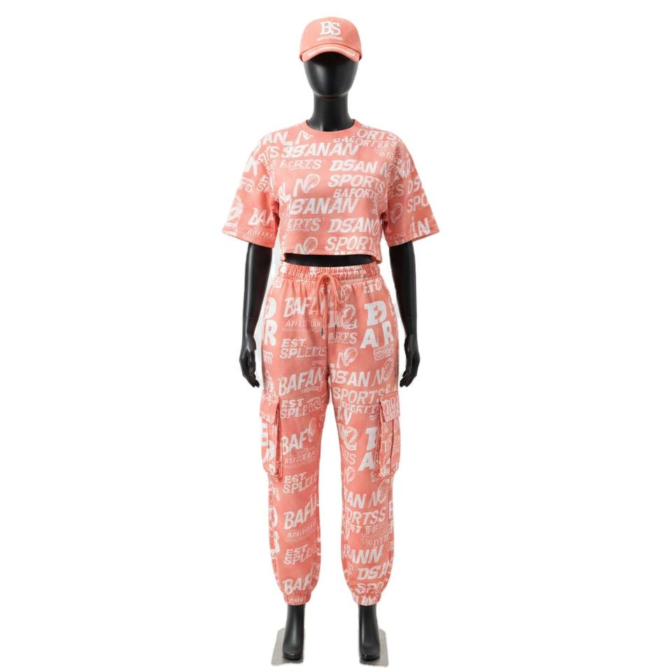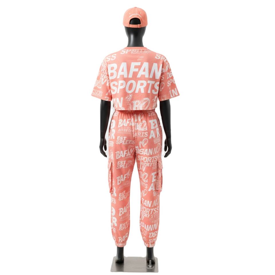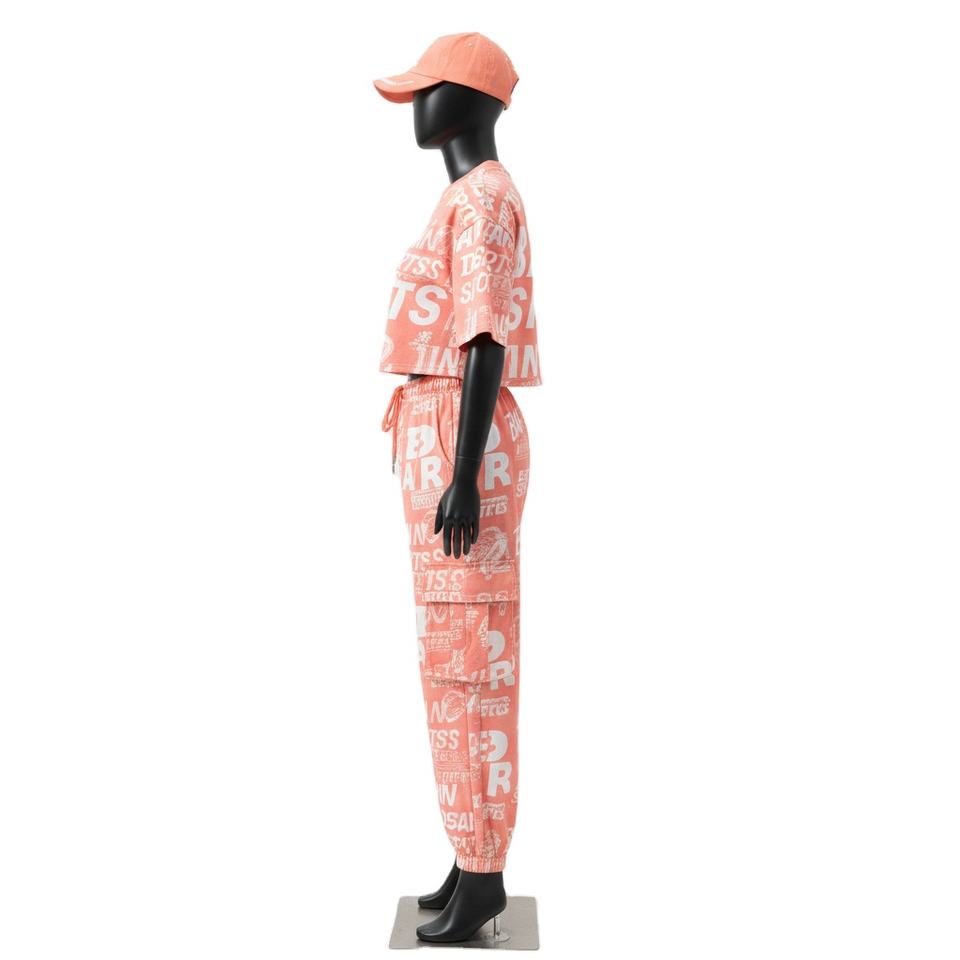 ชุดเสื้อครอปท็อปและกางเกงขายาวสำหรับผู้หญิง ผ้าคอตตอนเจอร์ซีย์พรีเมียม 180 กรัม สีพีชนุ่ม พิมพ์ลายสกรีนทั้งตัว พร้อมโลโก้สั่งทำ ชุดเซ็ตสำหรับผู้หญิง