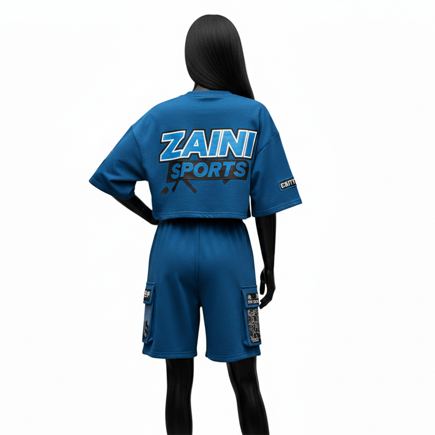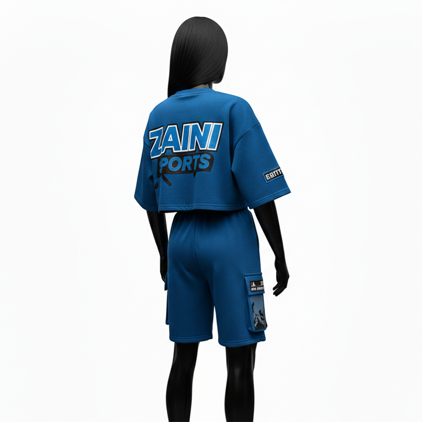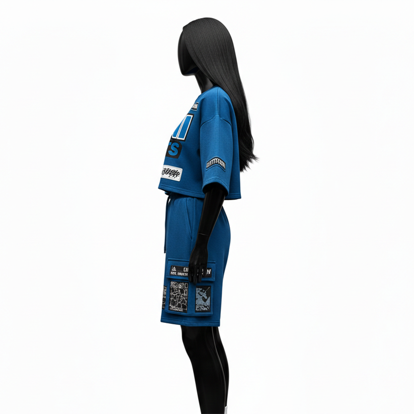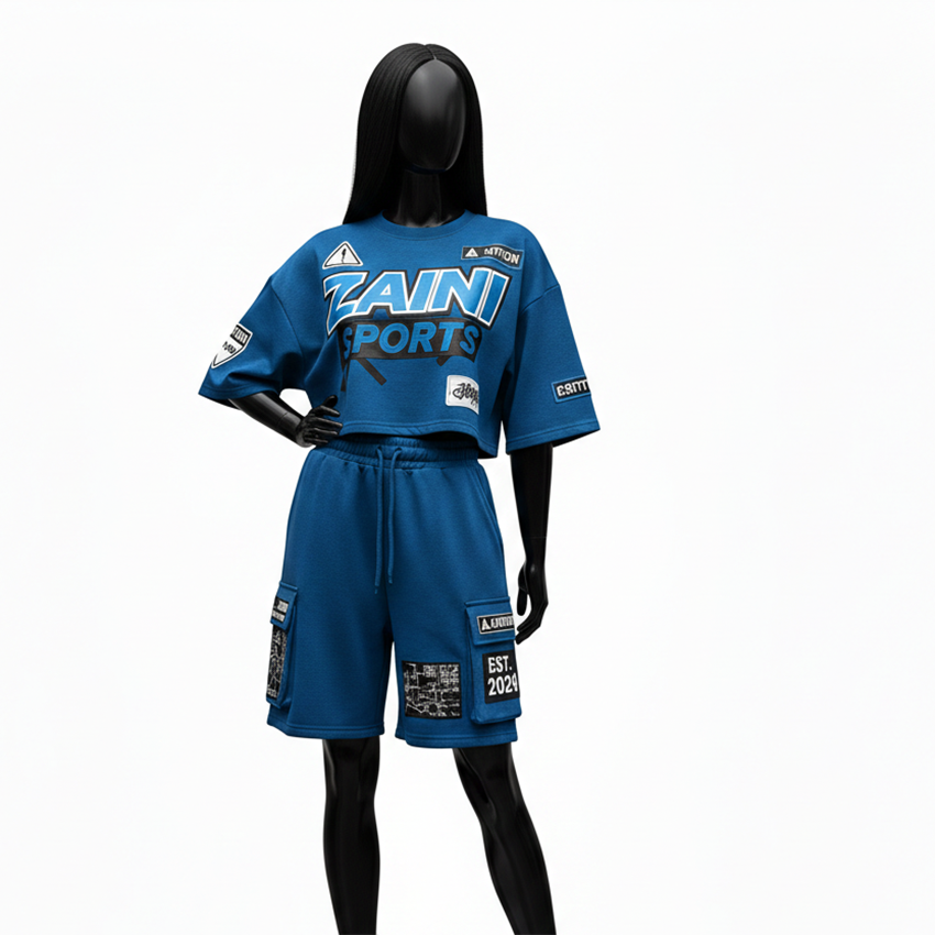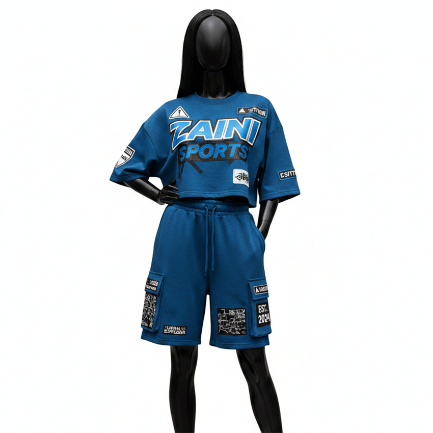 ชุดเสื้อยืดและกางเกงขาสั้นผ้าฝ้ายฟลีซคุณภาพสูงสำหรับผู้หญิง น้ำหนัก 240 กรัม ผ้าเรียบ สีน้ำเงิน รับสกรีนโลโก้ ชุดกีฬาสำหรับผู้หญิง
