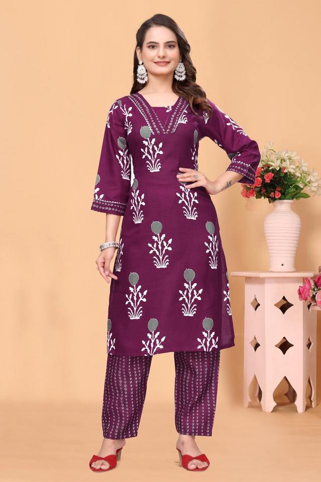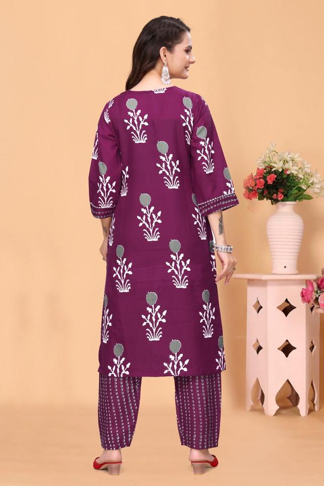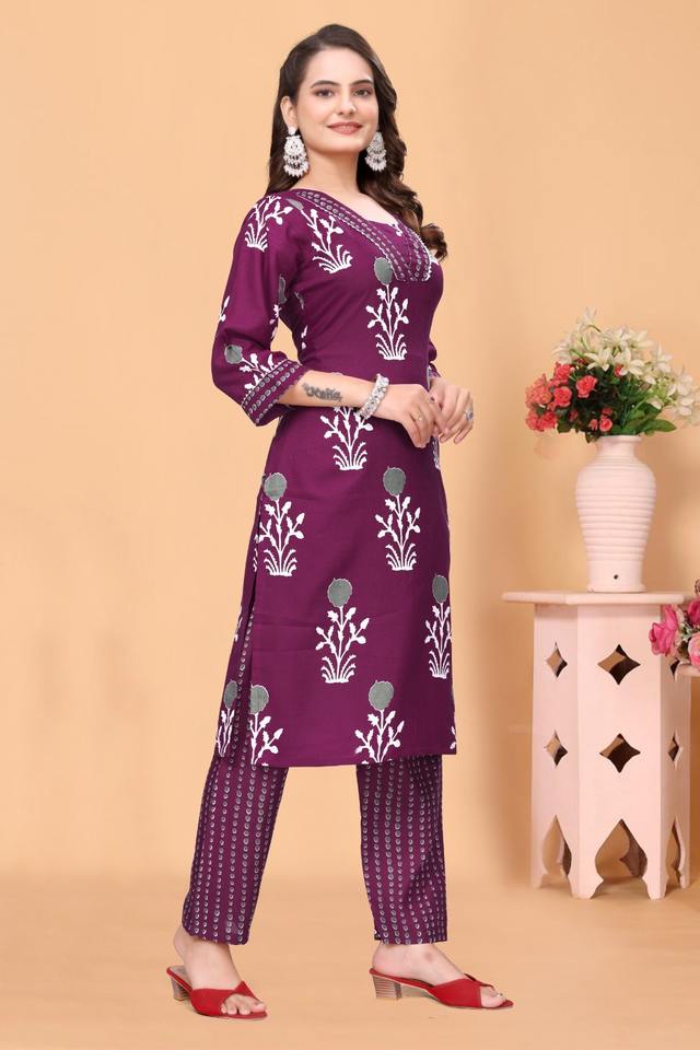 ชุดคุर्ตาพิมพ์ลายสีแดงเลือดหมูสำหรับผู้หญิง รุ่น 3008 ผ้าโพลีเรยอน เป็นมิตรกับสิ่งแวดล้อม ชุดเซ็ตขายส่ง ไซส์ S ถึง 3XL