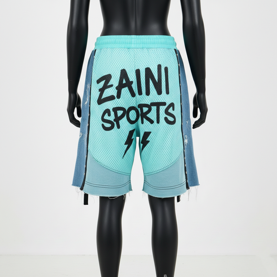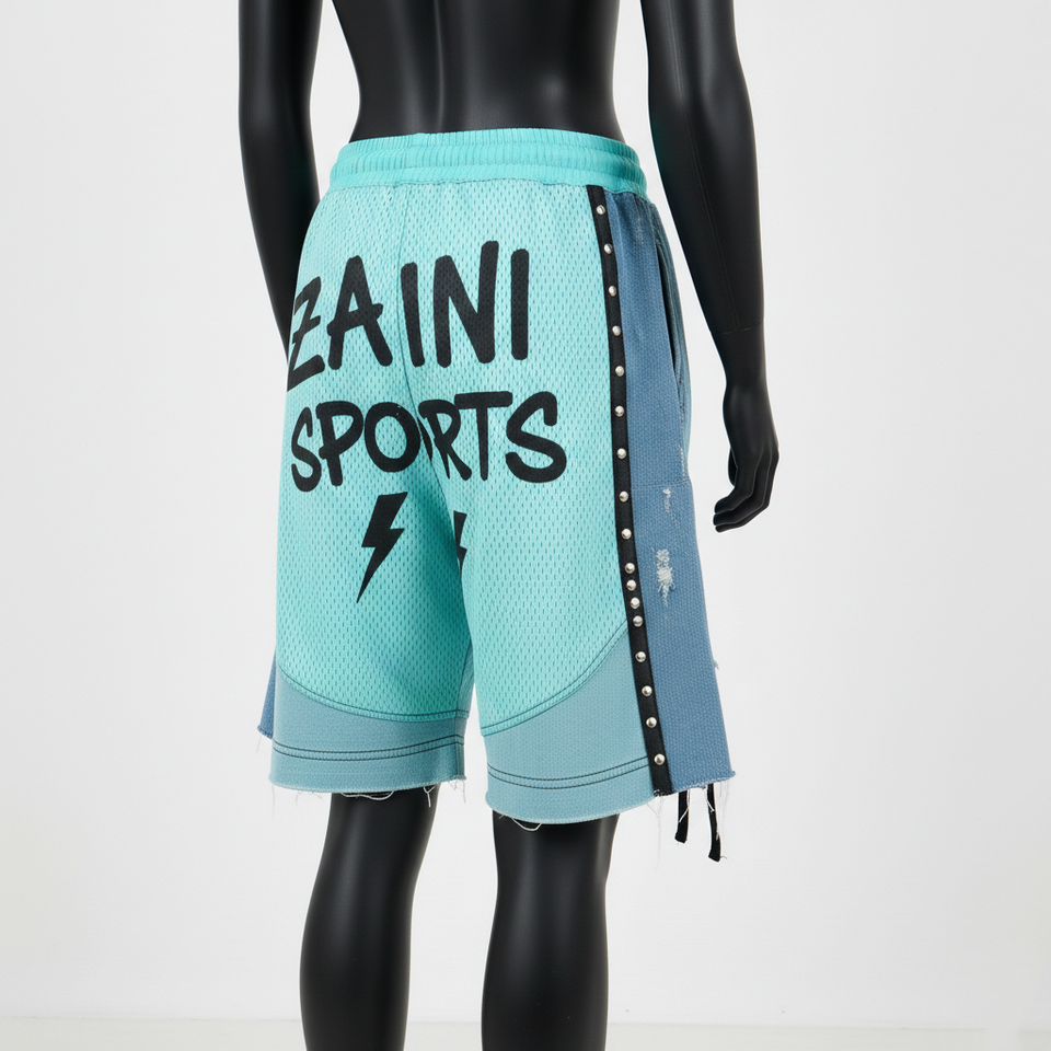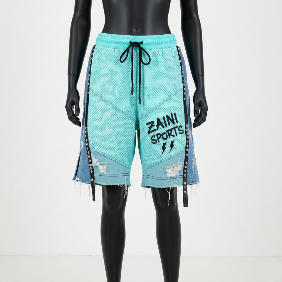 กางเกงขาสั้นผู้หญิงพรีเมียม 180 GSM ผ้าโพลีเมชระบายอากาศสีเขียวอมฟ้า แต่งแถบข้างด้วยผ้าเดนิม พร้อมโลโก้แบบรีดร้อนตามสั่ง