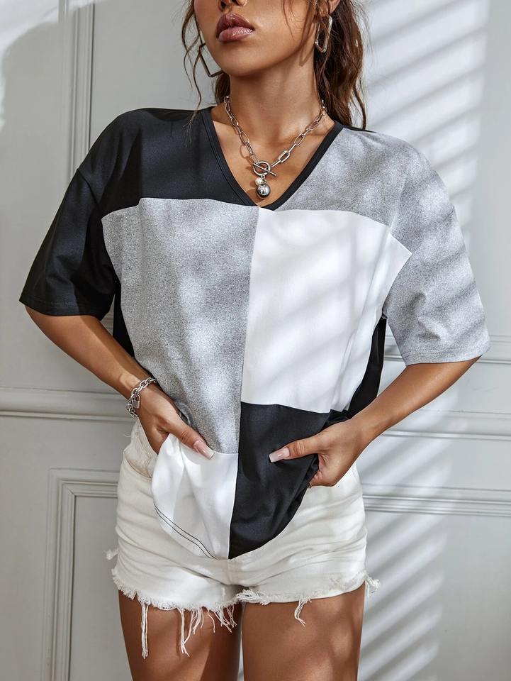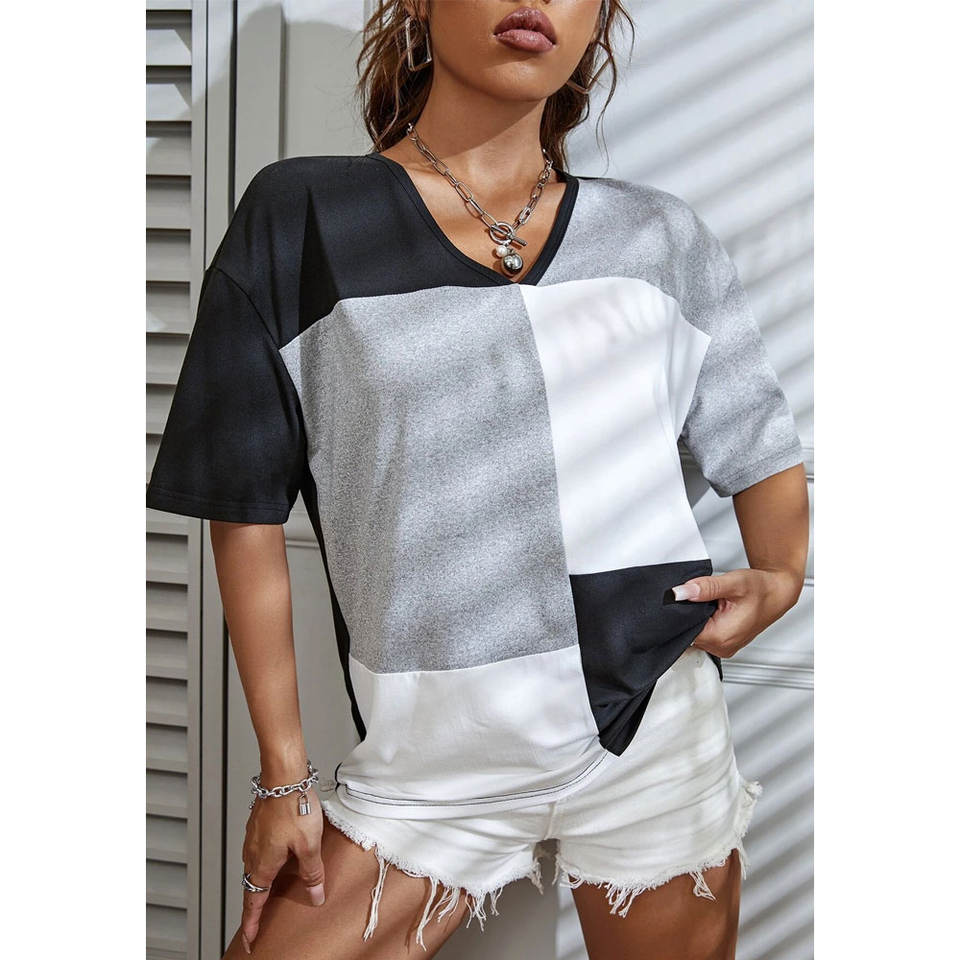 เสื้อยืดบล็อกสีผ้าฝ้าย100% สำหรับผู้หญิงเสื้อยืดลำลองใส่สบาย