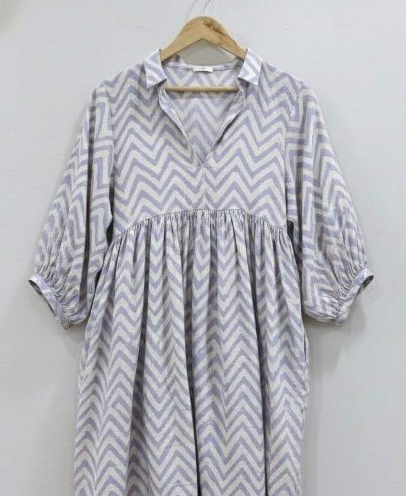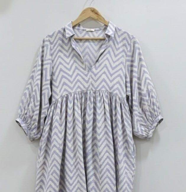 ชุดเดรสทำงานทรงเอไลน์ แขนพอง คอวี ลายดอกไม้วาดมือ ผ้าฝ้ายแท้ 100% ทอมือ ระบายอากาศได้ดี สวมใส่สบาย