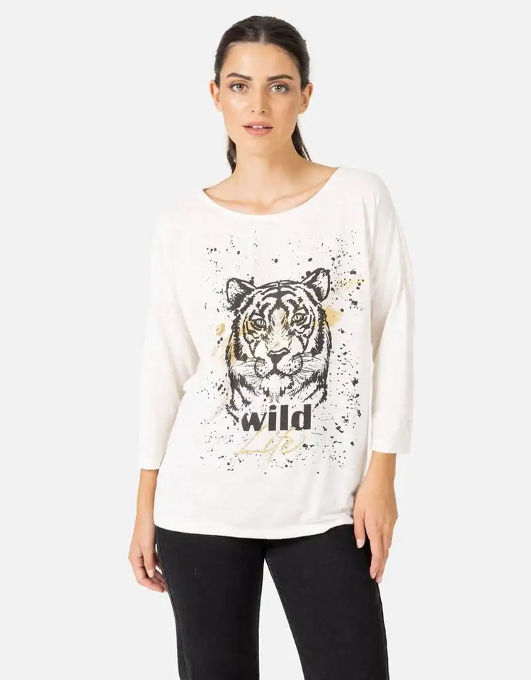 Women's 100% Cotton Knitted Full Sleeve Eco-Friendly Casual T-Shirts with Stylish Animal Print and Feather Decoration