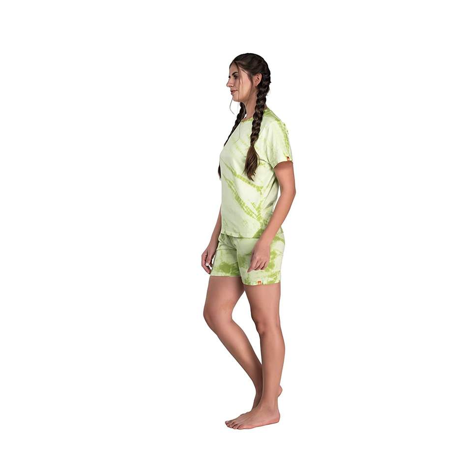 ชุดนอนผู้หญิงผ้าฝ้ายถัก 100% ลายมัดย้อม 2 ชิ้น แขนสั้น เนื้อผ้านุ่ม ระบายอากาศดี กางเกงเอวยางยืด มีเชือกผูก ปรับแต่งได้