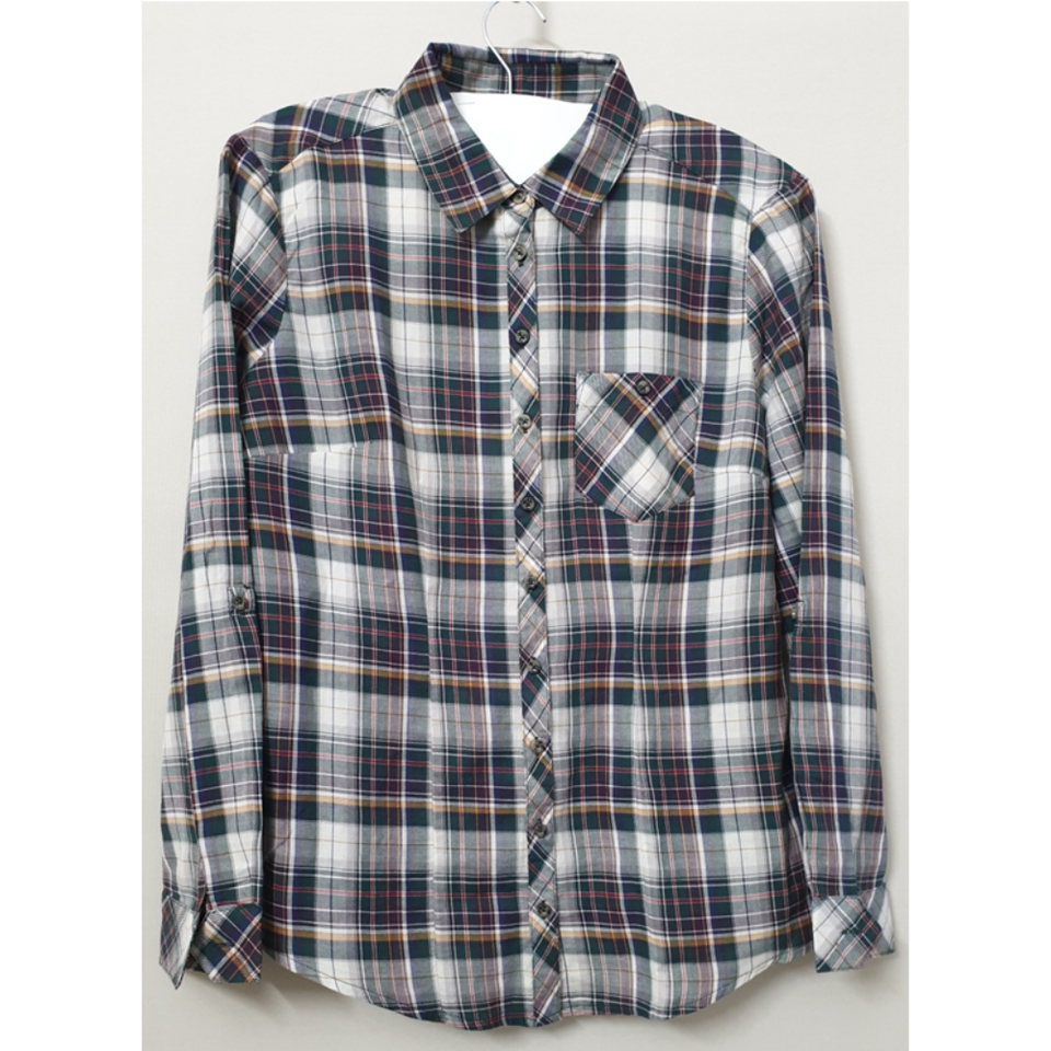 เสื้อเชิ้ตผู้หญิงผ้าป๊อปลิน 100% ลายตาราง คอปกตั้ง แขนยาว ติดกระดุม ทรงธุรกิจ ซักได้ ย้อมเส้นด้าย