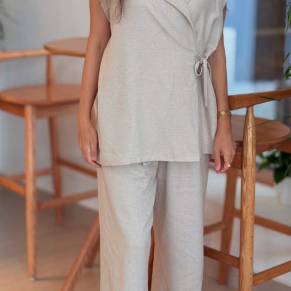 Women's 100% Linen Casual Style 2-Piece Set Sleeveless Satin Jacquard Shirt & Wide Leg Pants Solid Pattern Loose Fit