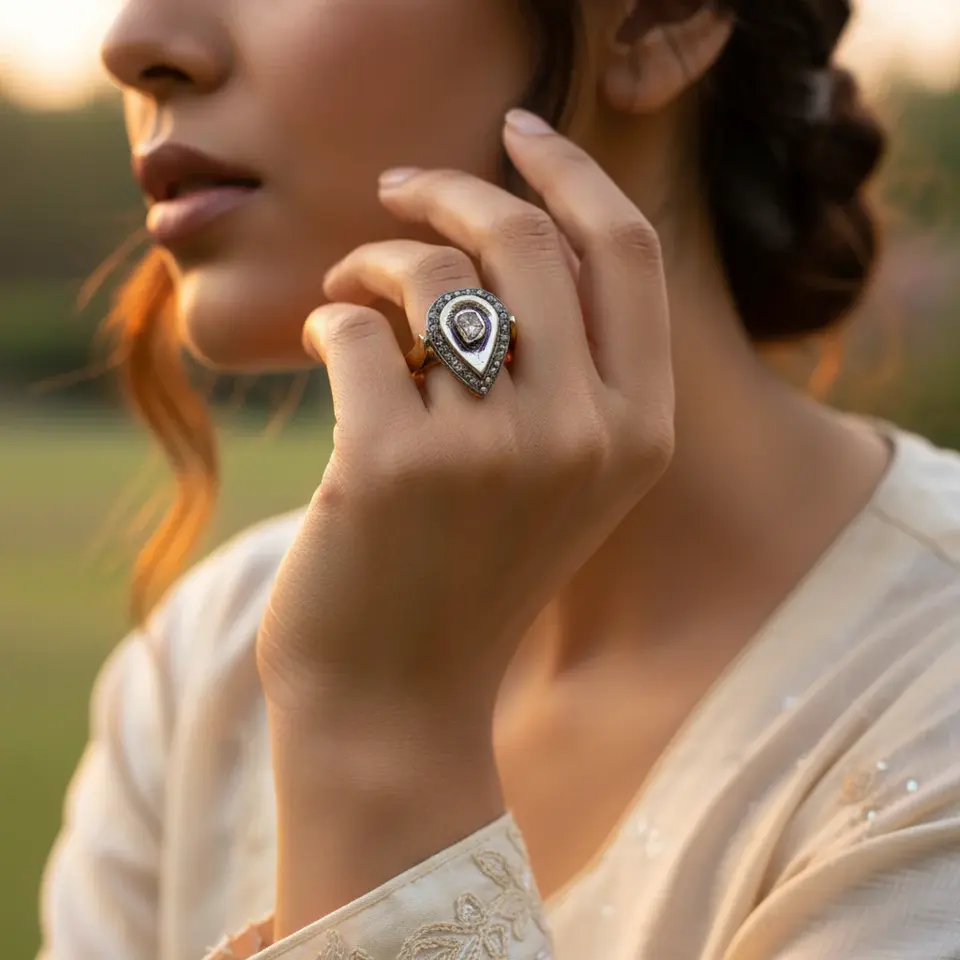 แหวนทรงลูกแพร์ชุบทอง 14K สำหรับผู้หญิง ประดับเพชรแบบฮาโล ชุบโรเดียมและเวอร์เมล บนตัวเรือนแพลตตินัม