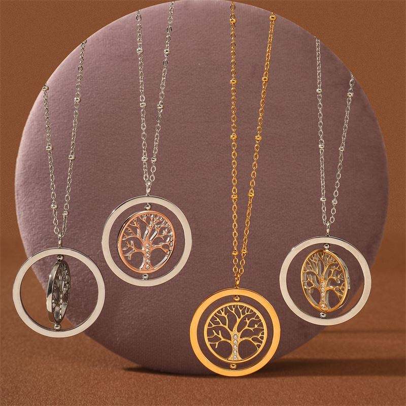 Women's 18K Gold Plated Titanium Steel Necklace with Diamond-Encrusted Rotating Tree Life Pendant New Fashion Accessory
