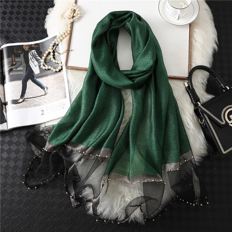 ผ้าพันคอไหมเทียมสีพื้นสำหรับผู้หญิง 1 ผืน ขนาดกลาง ใช้ได้หลากหลาย ผ้าคลุมไหล่ประดับลูกปัด ใช้ได้ทุกฤดู ผ้าคลุมศีรษะสำหรับเดินทาง ป้องกันแสงแดด
