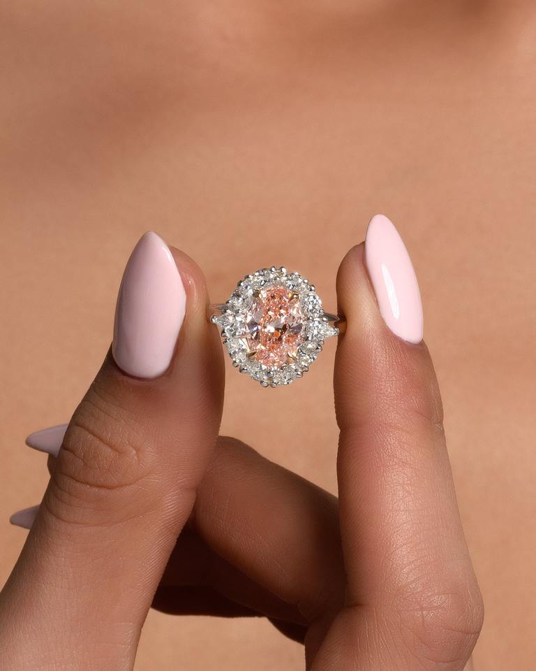 แหวนหมั้นเพชรทรงรีสีชมพูสดใส น้ำหนัก 2.35 กะรัต สำหรับผู้หญิง เพชรเพาะเลี้ยงในห้องปฏิบัติการ ตัวเรือนทองคำแท้ 18K รับรองโดย IGI ดีไซน์หรูหราโดดเด่นด้วยวงแหวนรอบเพชร