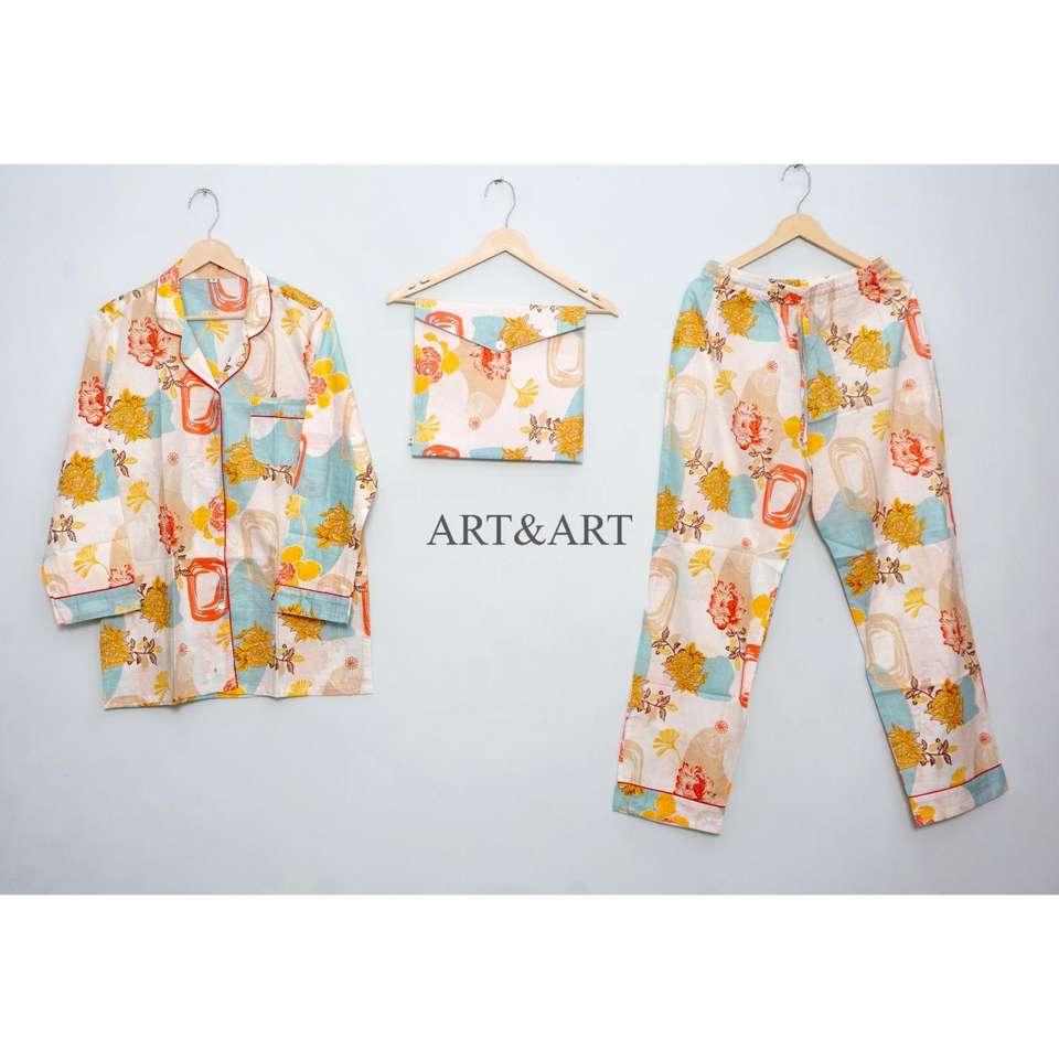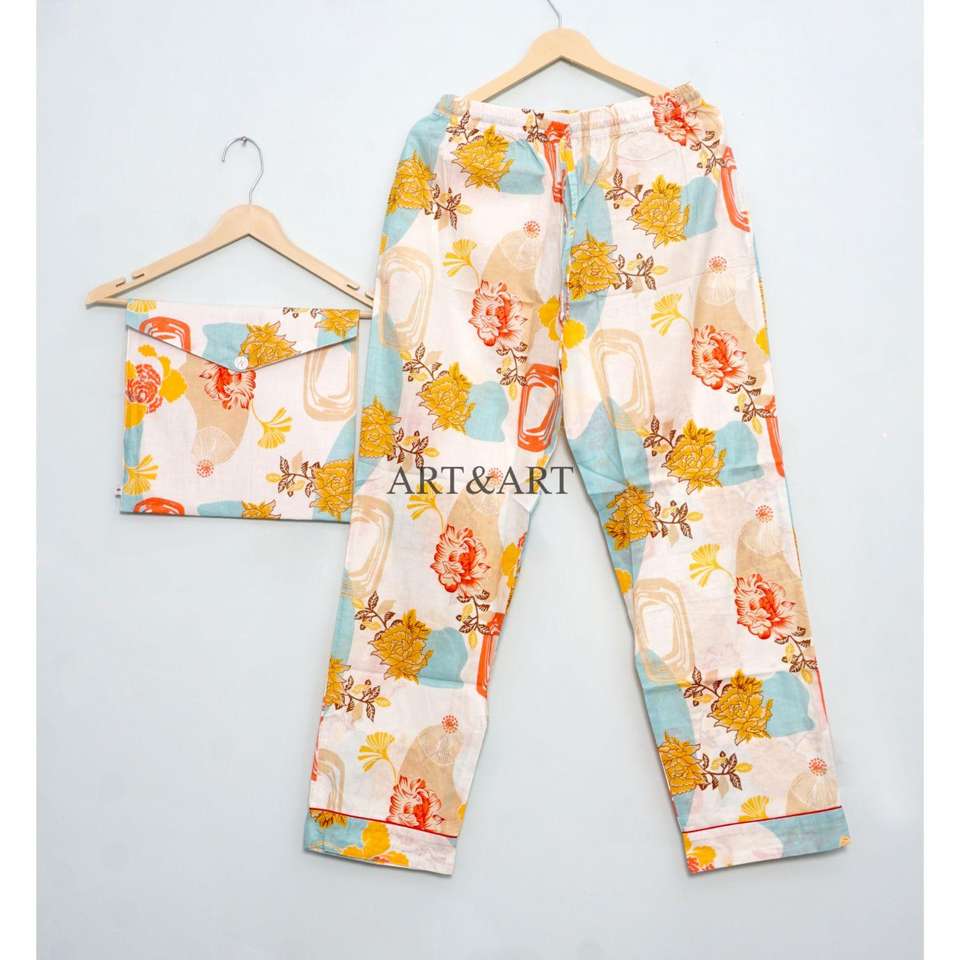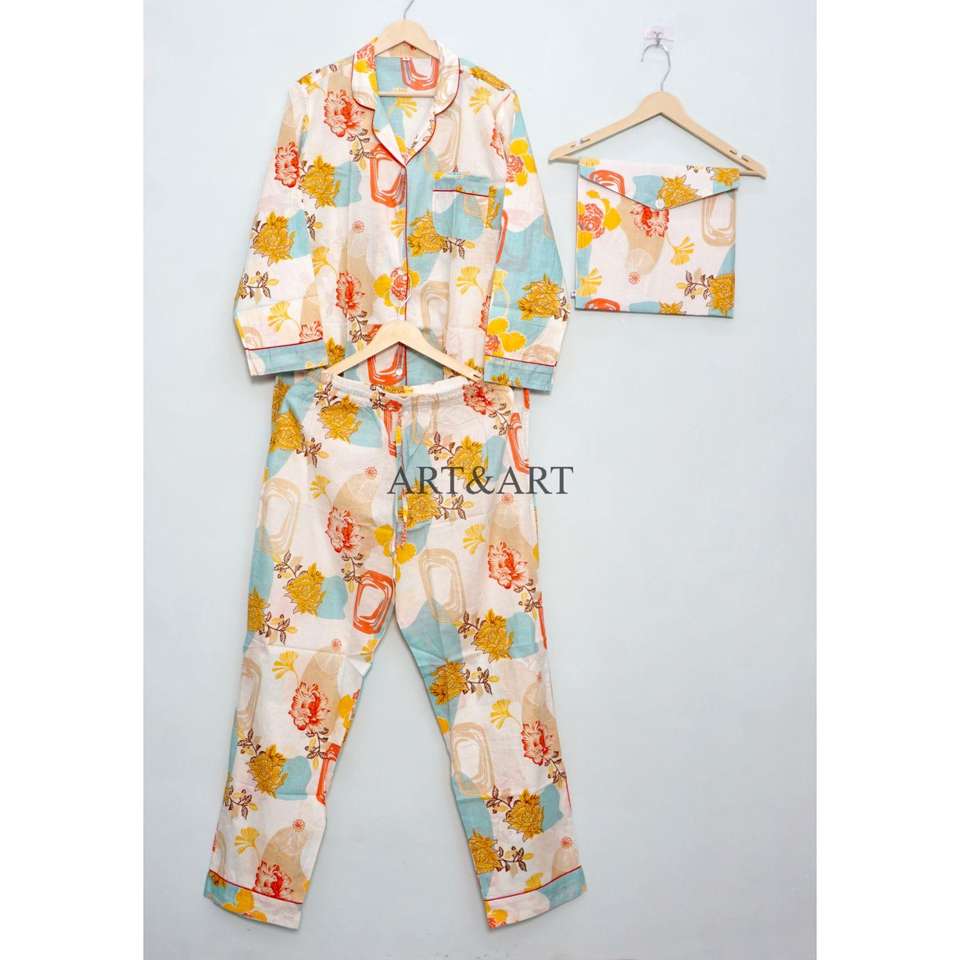 ชุดนอนผู้หญิงลายดอกไม้ 2 ชิ้น แขนยาว ติดกระดุม ผ้าฝ้ายออร์แกนิค 100% พร้อมถุงผ้าฝ้าย