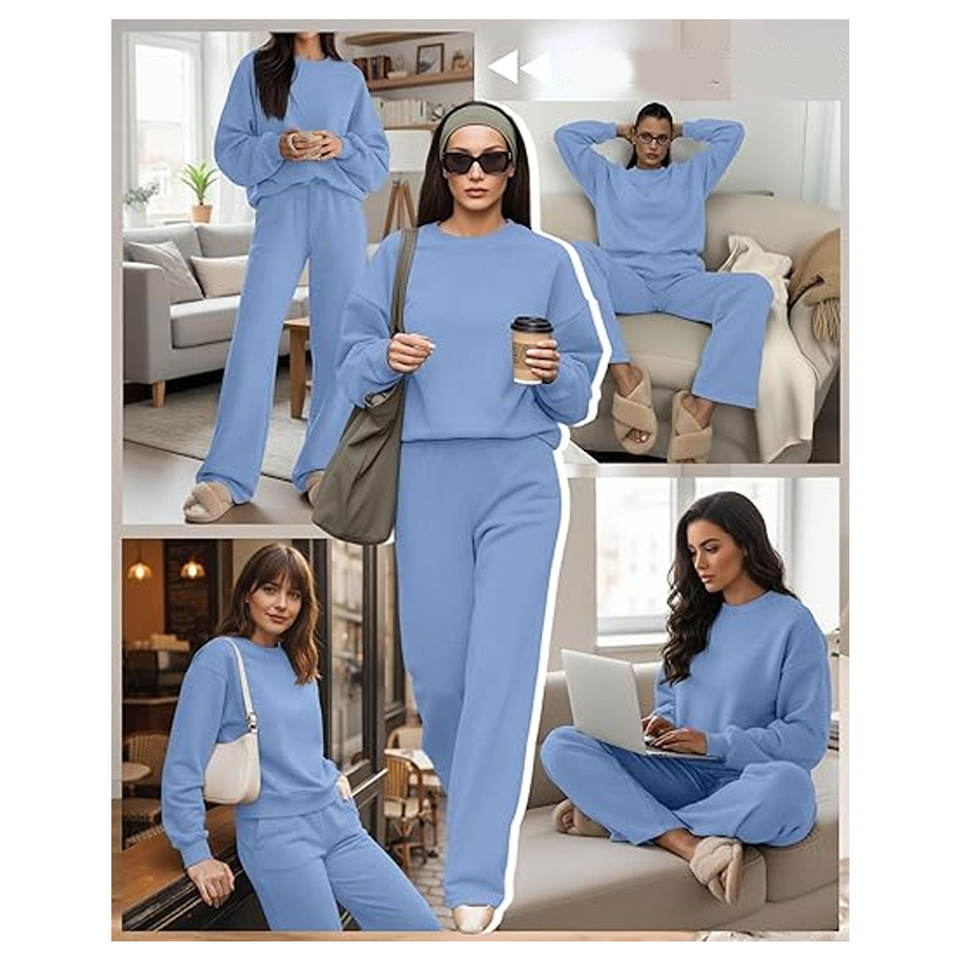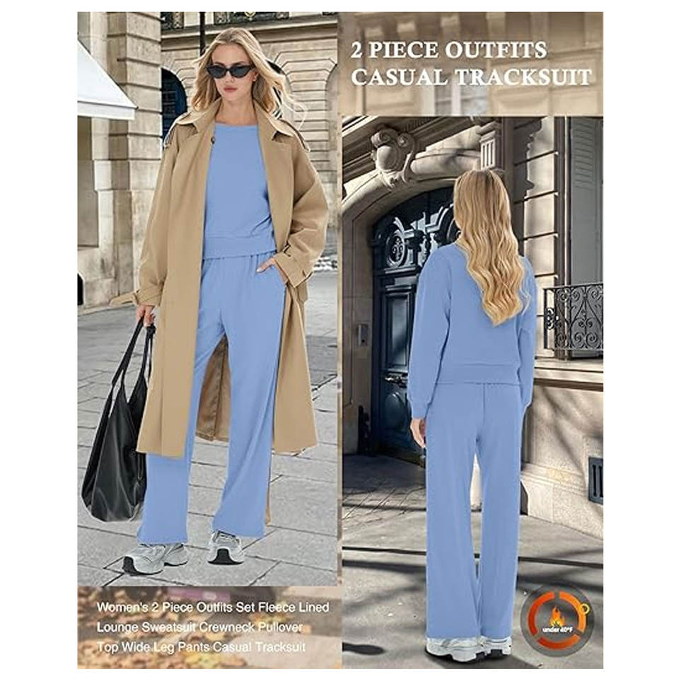 ชุดเซ็ต 2 ชิ้นสำหรับผู้หญิง ชุดลำลองบุขนแกะ เสื้อคอกลมแขนยาว กางเกงขายาวทรงกว้าง ชุดลำลองสวมใส่สบาย