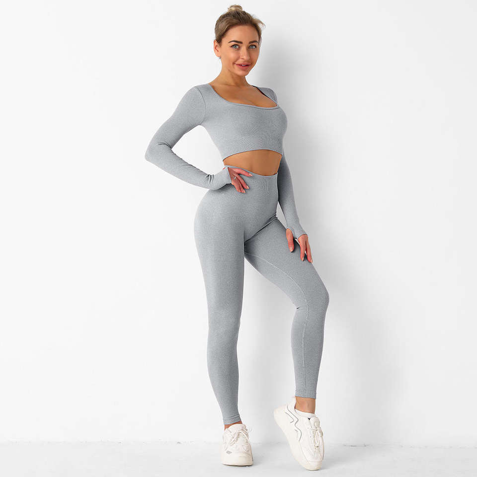 ชุดโยคะไร้ตะเข็บ2ชิ้นด้านหน้าสีล้วนของผู้หญิงเสื้อผ้าออกกำลังกายพร้อมกางเกงขาสั้นชุดออกกำลังกายในยิมสำหรับเล่นกีฬา
