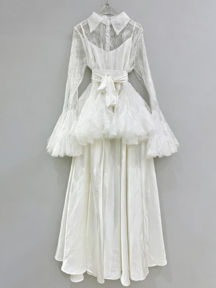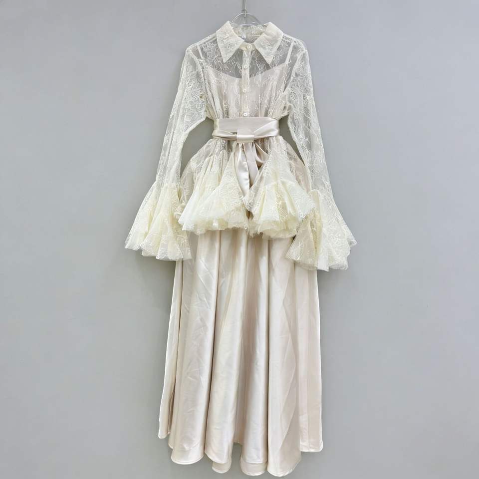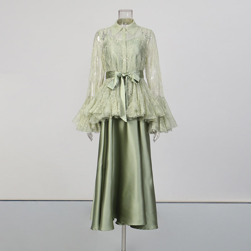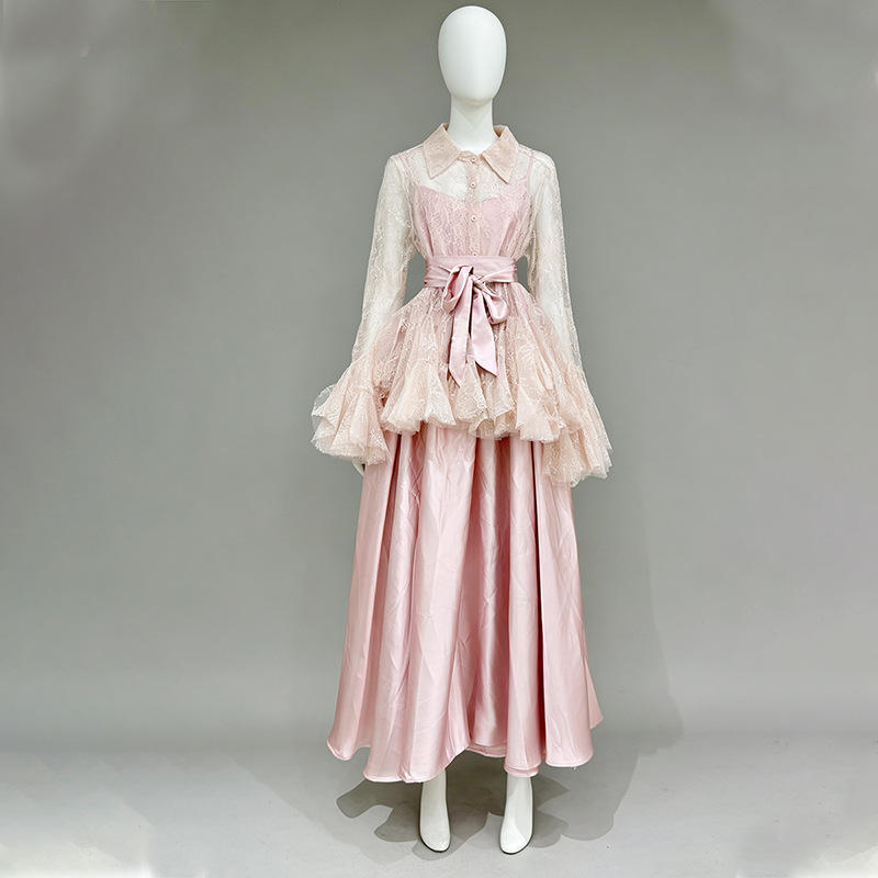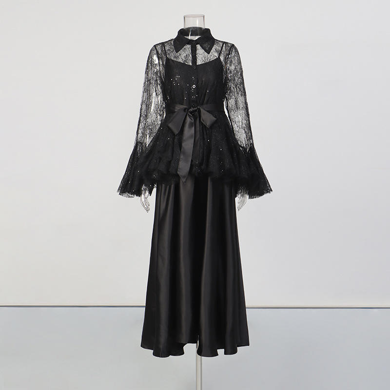 ชุดเซ็ต 2 ชิ้นสำหรับผู้หญิง เสื้อลูกไม้ประดับเลื่อมผูกเชือก ชุดเดรสยาวแฟชั่น