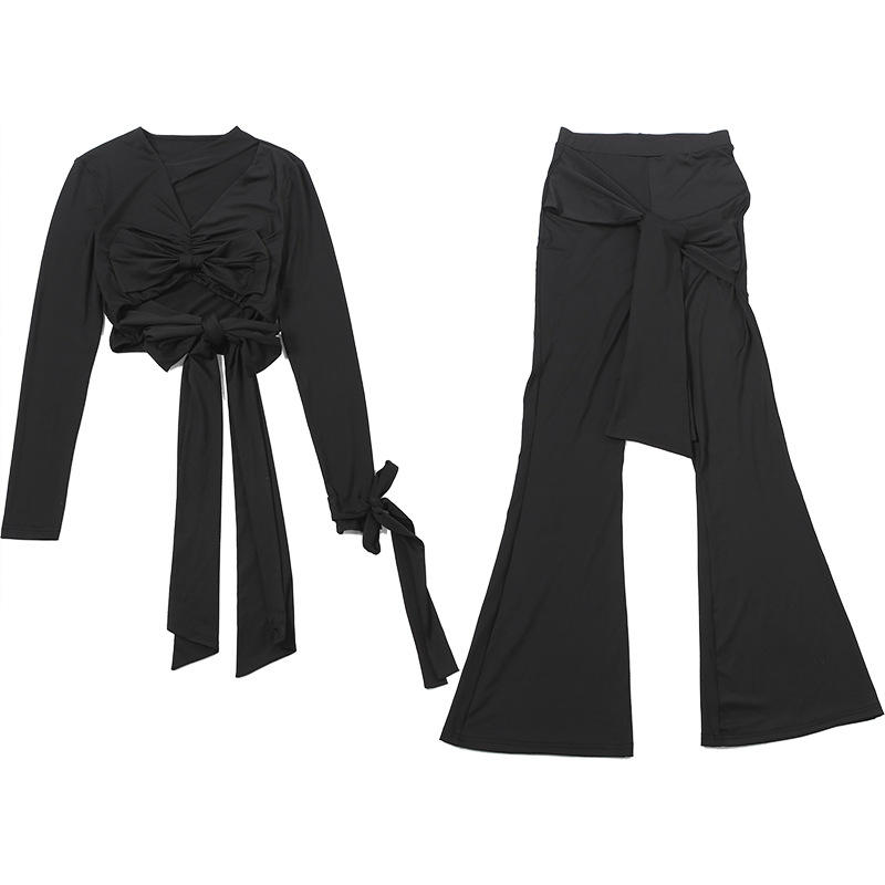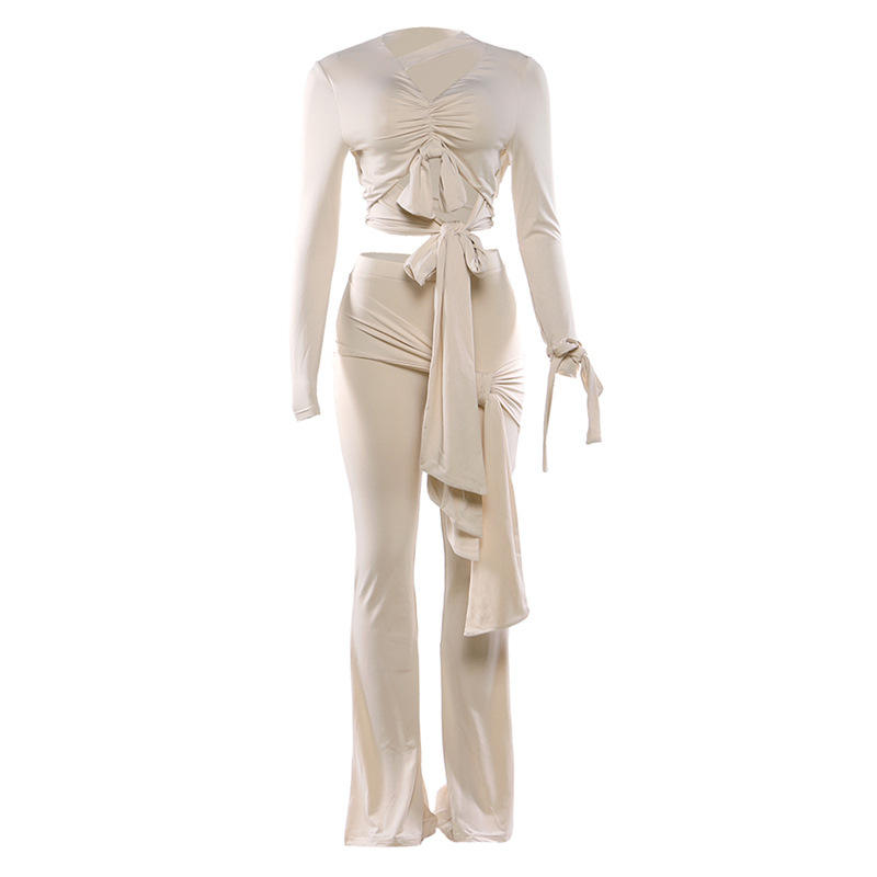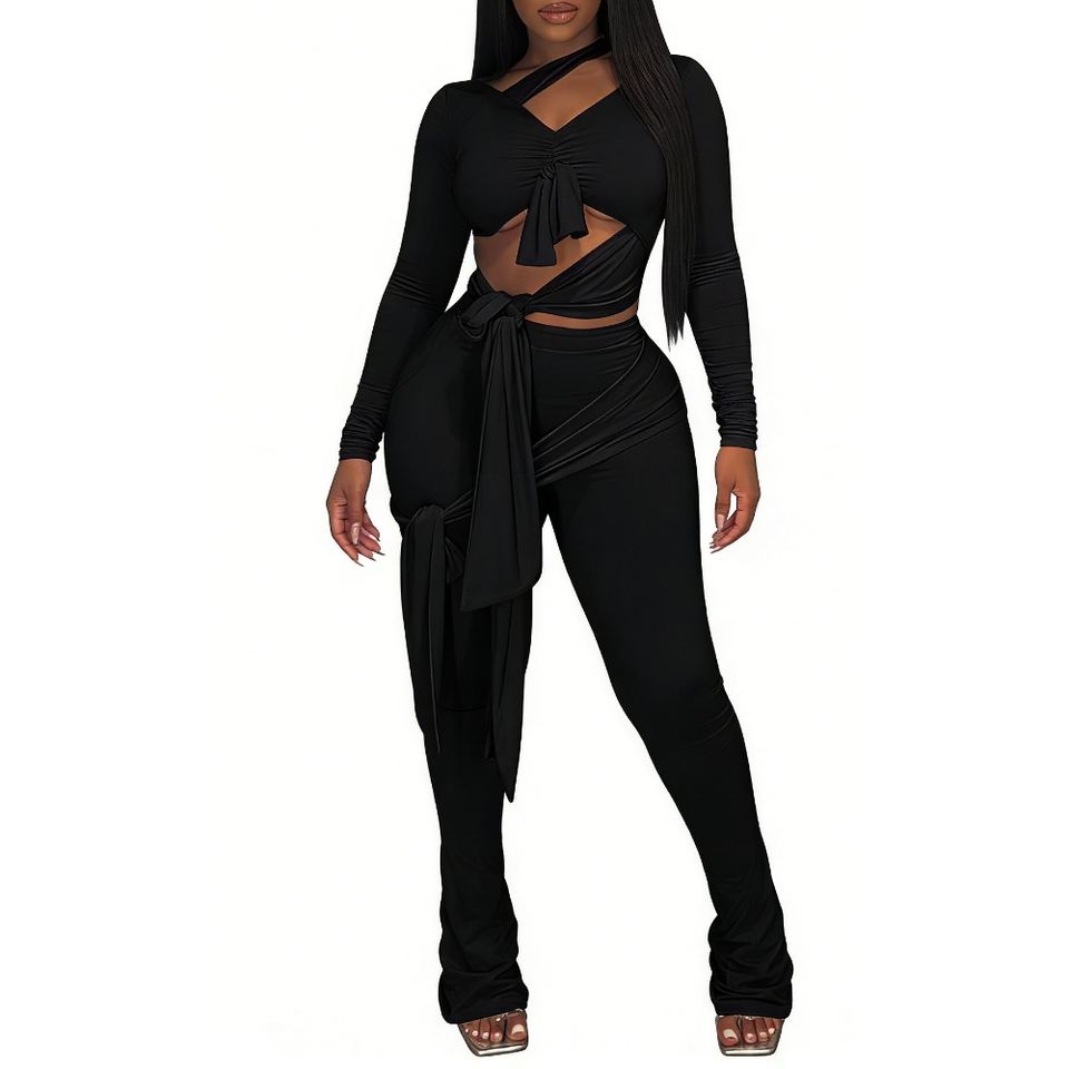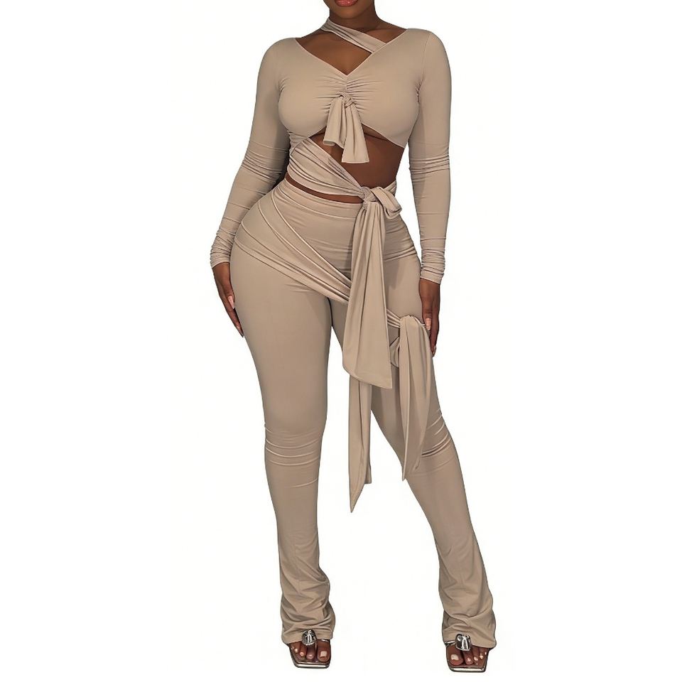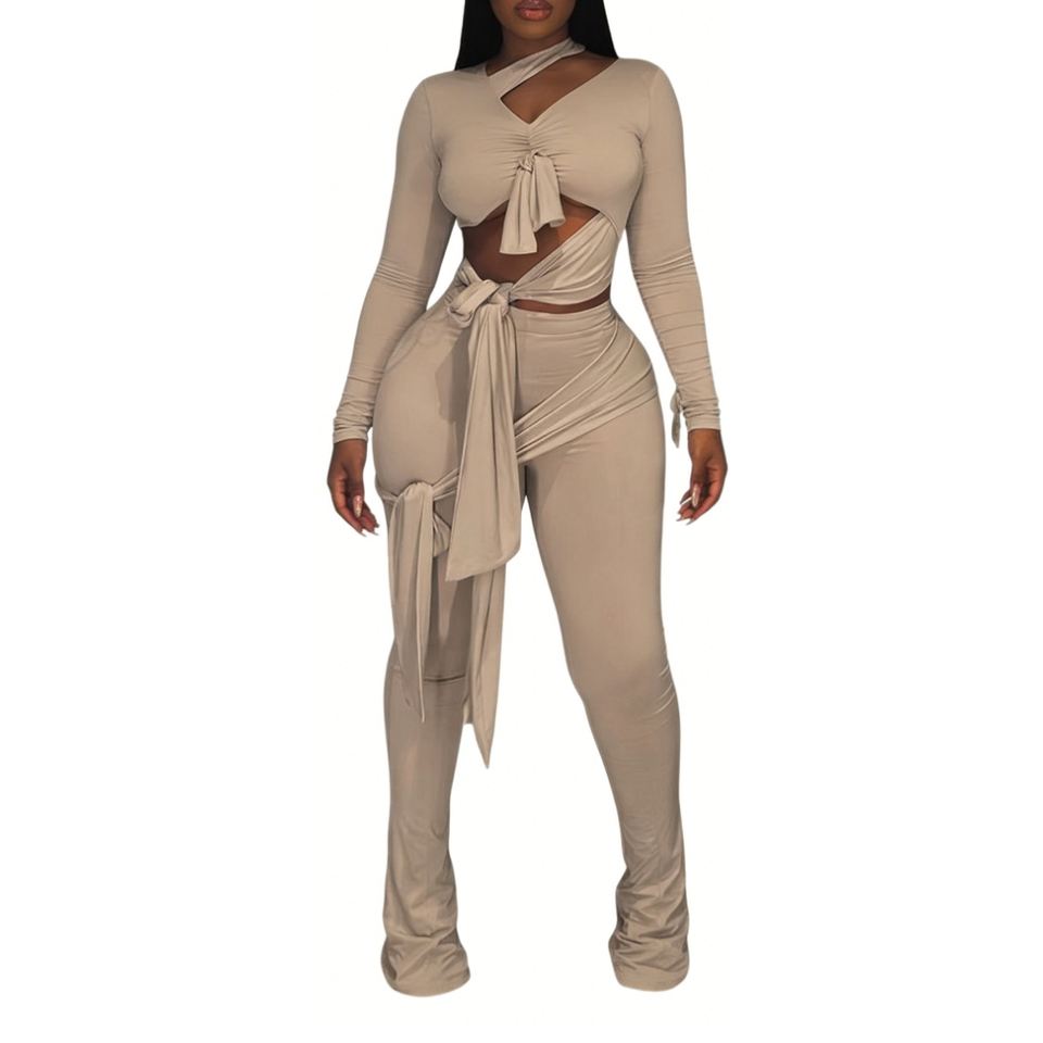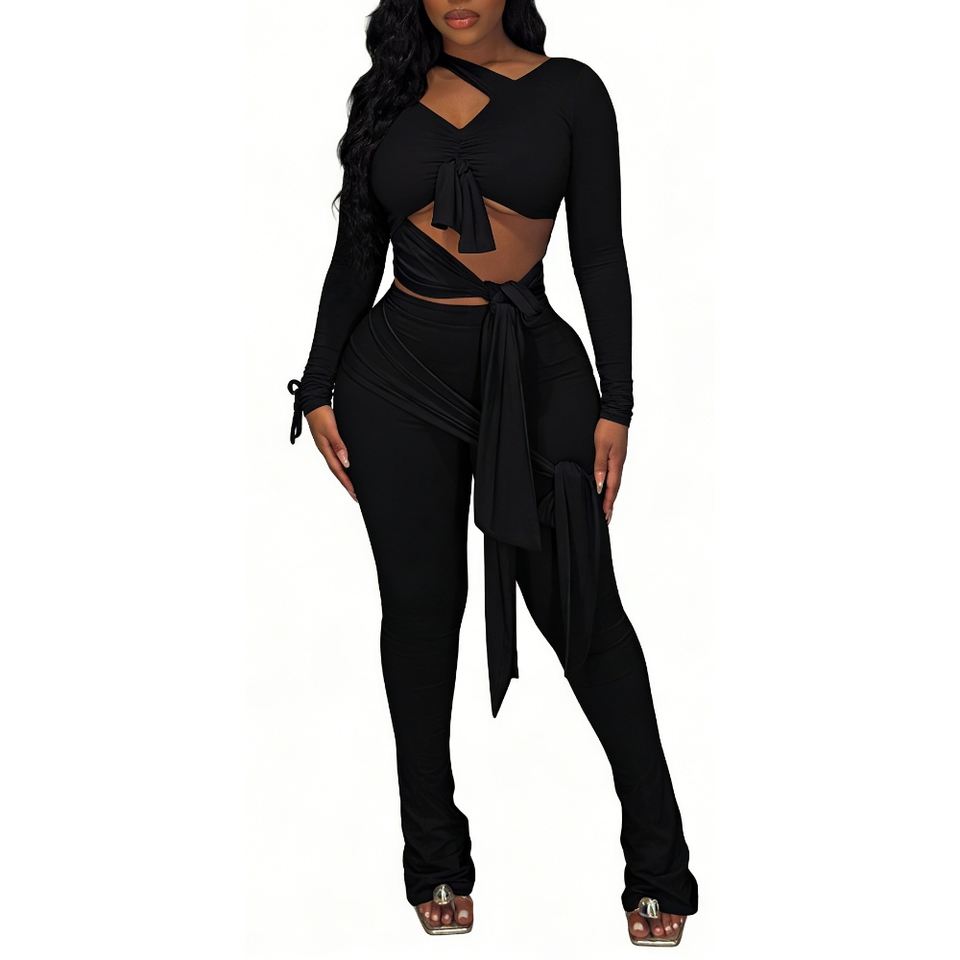ชุดเซ็ต 2 ชิ้นสำหรับผู้หญิง เสื้อครอปแขนยาวแบบเว้าด้านข้าง และกางเกงขาบานเอวสูงพร้อมดีเทลผูกเชือก แฟชั่น