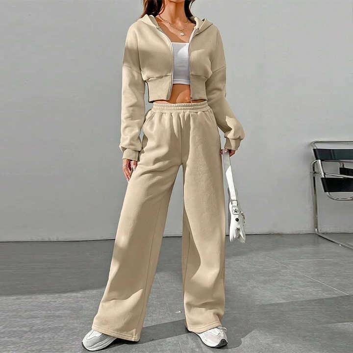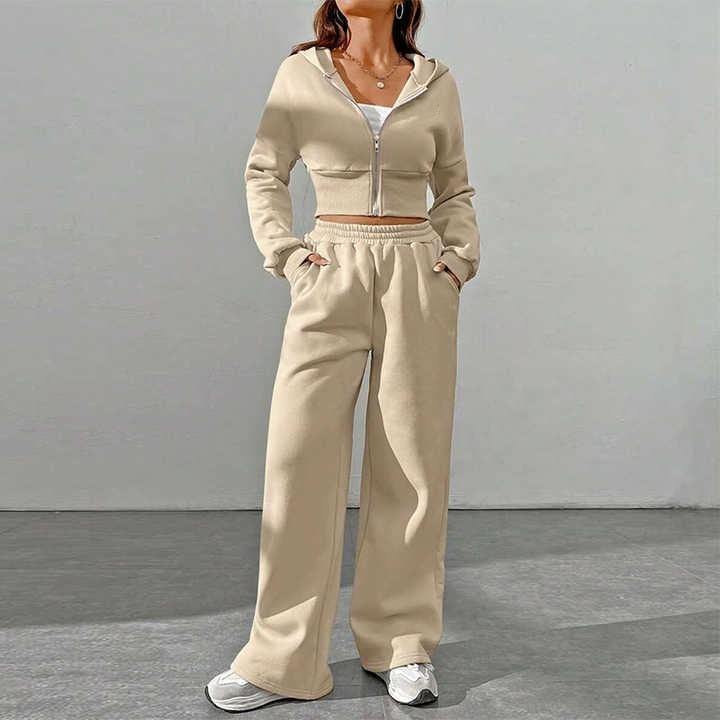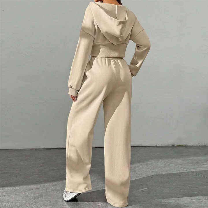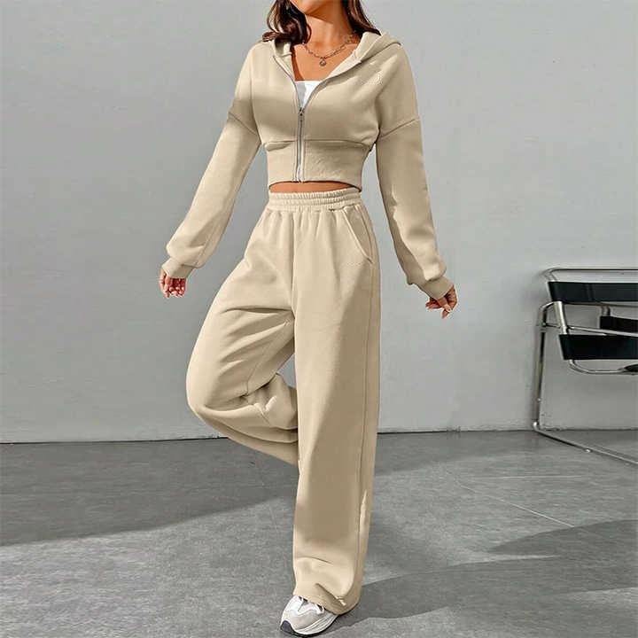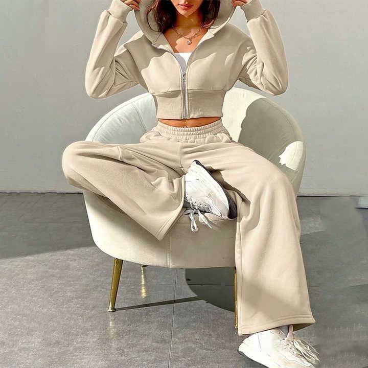 ชุดออกกำลังกายฤดูหนาวสำหรับผู้หญิงแบบ 2 ชิ้น กางเกงวอร์มมีฮู้ดพร้อมซิปยาว เสื้อฮู้ดหลวมๆ