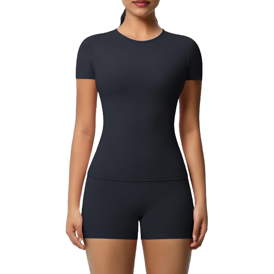ชุดออกกำลังกายสำหรับผู้หญิง - เสื้อยืดโยคะแขนสั้นและกางเกงขาสั้นสำหรับออกกำลังกาย วิ่ง และฟิตเนส | ชุดออกกำลังกายแบบแห้งเร็ว