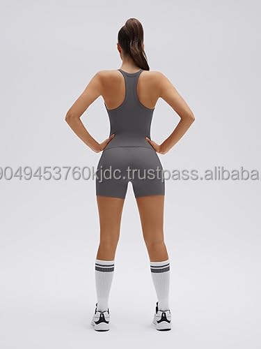 ชุดออกกำลังกายผู้หญิงแบบ 2 ชิ้น กางเกงขาสั้นเอวสูงมีกระเป๋า เสื้อกล้ามทรง Racerback คอวี ระบายอากาศ ป้องกันแบคทีเรีย