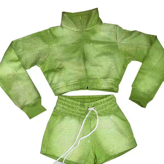 ชุดเซ็ตเสื้อครอปและกางเกงขาสั้น 2 ชิ้นสำหรับผู้หญิง สกรีนโลโก้ได้ตามต้องการ ชุดฤดูร้อนประดับเพชร ชุดสเวตสูท เสื้อและกางเกงขาสั้น รุ่นปี 2026