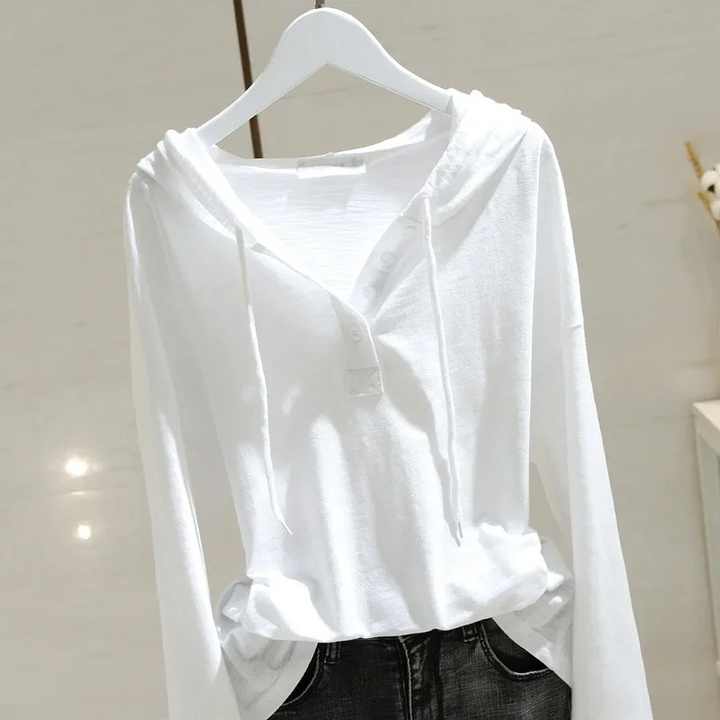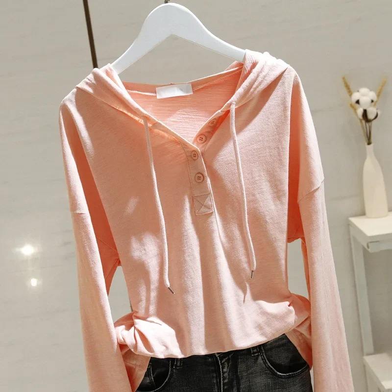 เสื้อยืดผ้าฝ้ายแขนยาวมีฮู้ดสำหรับผู้หญิง, เสื้อยืดลำลองทรงหลวมดีไซน์กระชับสัดส่วนสำหรับฤดูใบไม้ผลิและฤดูใบไม้ร่วง2024