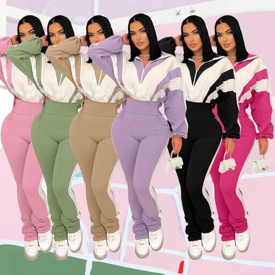 ชุดจ็อกเกอร์แขนยาวแบบมีซิปสำหรับผู้หญิงชุดกางเกงรัดรูปเอวยางยืดแบบสองชิ้นลายทางเรียบย้อม2025ฤดูใบไม้ร่วง