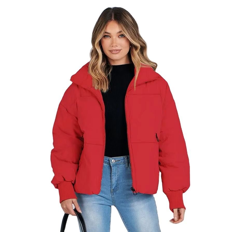 แจ็กเก็ตแบบมีซิปแขนยาวของผู้หญิงเสื้อโค้ทตัวสั้นทรงถุงมีกระเป๋าเสื้อแจ็คเก็ตปลาปักเป้าระบายอากาศได้ดี2025ฤดูหนาวทำจากประเทศปากีสถาน
