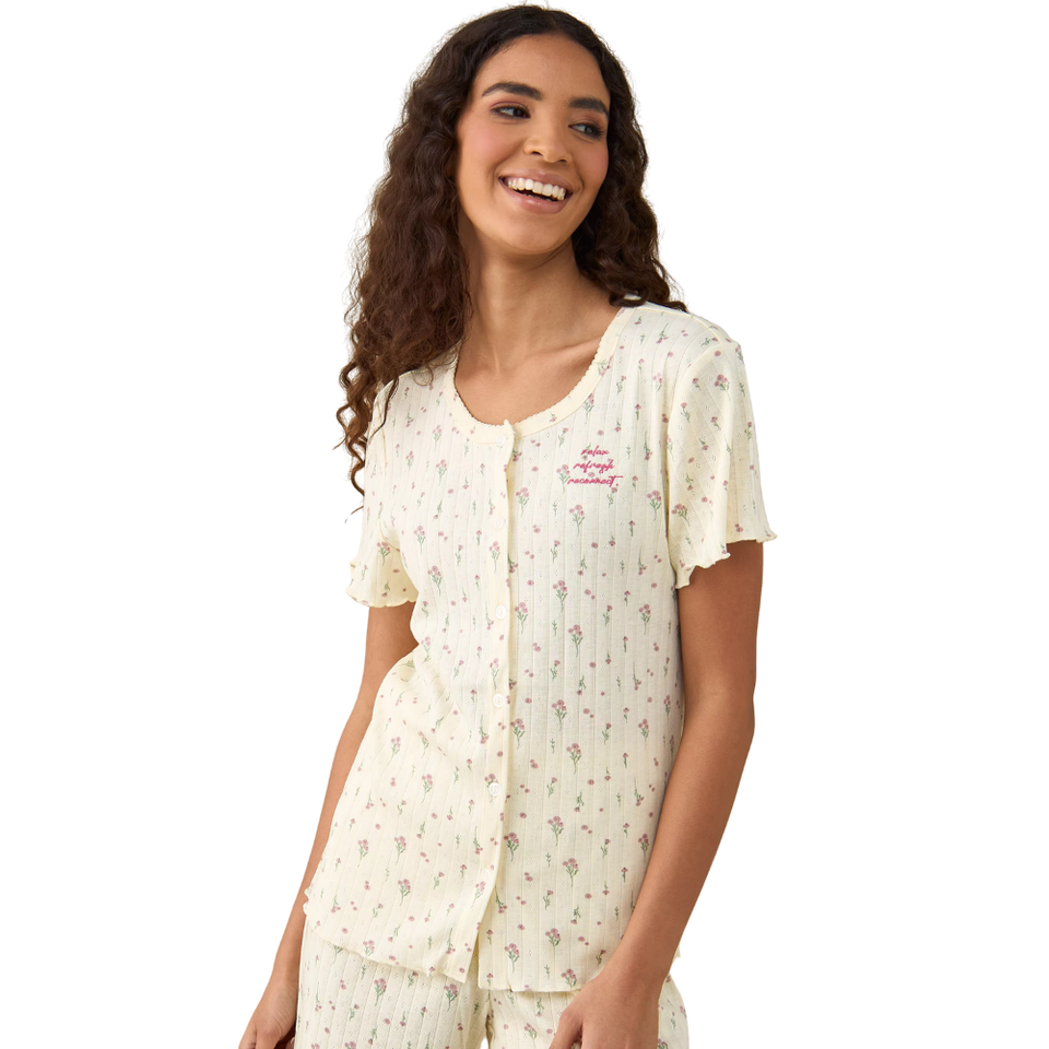 ชุดนอนผ้าฝ้ายติดกระดุมสำหรับผู้หญิง2ชิ้น, ชุดนอนครอบครัวชุดเข้าชุดกันเอวยางยืดพิมพ์ลายผีเสื้อมีโลโก้ด้านหน้า
