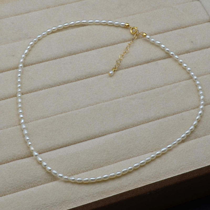 สร้อยคอมุกน้ำจืดธรรมชาติขนาด 3-4 มม. สำหรับผู้หญิง ดีไซน์หรูหรา แผ่นมุกแบนเล็ก สร้อยคอแบบคล้องไหปลาร้า ดีไซน์เรียบหรู ดูมีระดับ