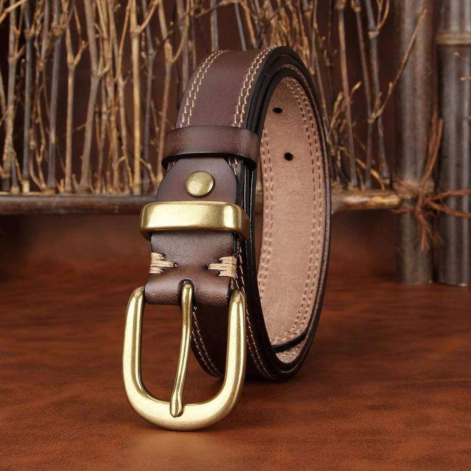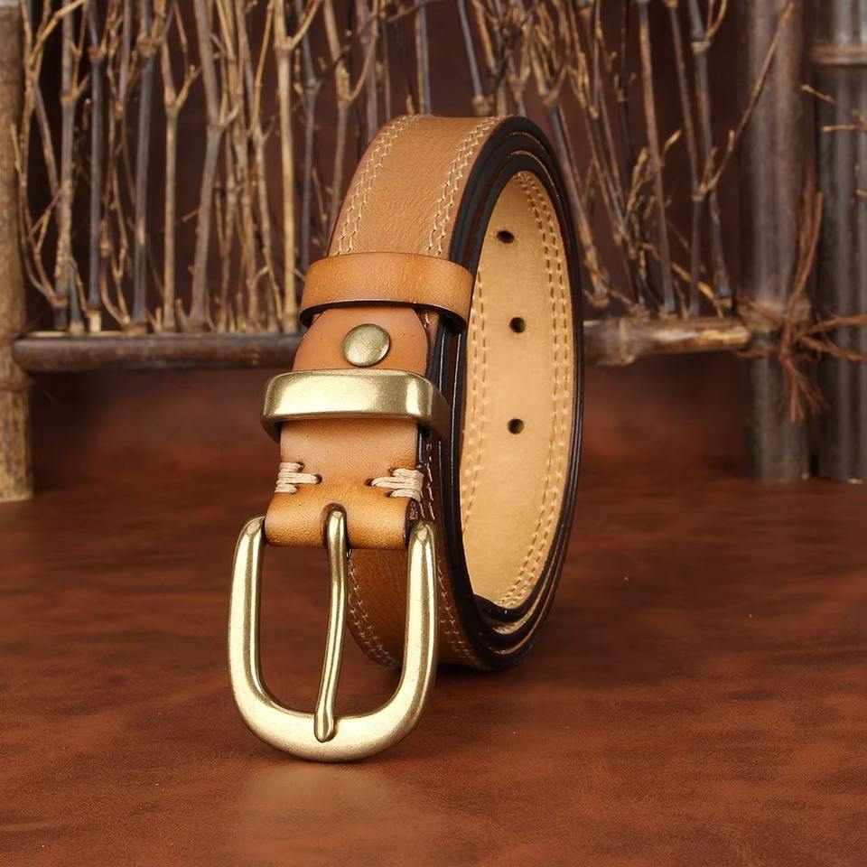 เข็มขัดหนังวัวแท้สำหรับผู้หญิง ขนาด 3.8 ซม. เย็บสองชั้น หัวเข็มขัดทองเหลืองทรงสี่เหลี่ยม ลายดอกไม้ สีน้ำตาลอ่อน สำหรับใส่กับกางเกงยีนส์