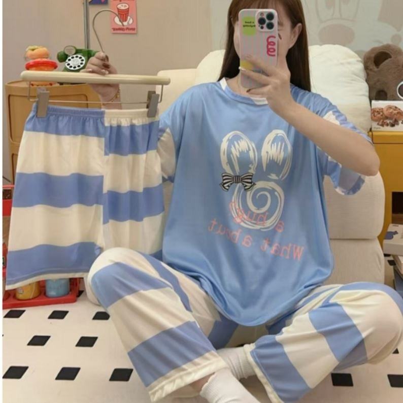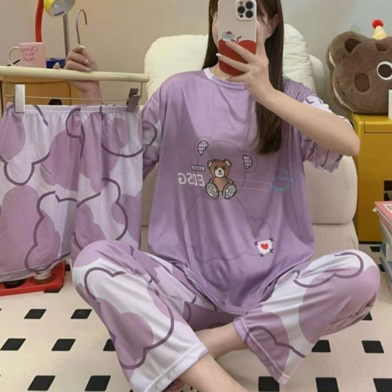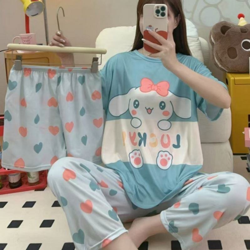 ชุดนอน3 In1สำหรับผู้หญิงกางเกงขาสั้นแขนสั้นกางเกงขาสั้น3ชิ้นชุดนอนนุ่มแบบเกาหลีสำหรับใส่ในบ้านลายการ์ตูน