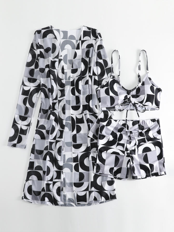 ชุดว่ายน้ำบิกินี่ผู้หญิงแบบ 3 ชิ้น ผ้าไร้ตะเข็บ 100% โพลีเอสเตอร์ ระบายอากาศ แห้งเร็ว พร้อมเสื้อคลุมแขนยาวและเชือกผูก