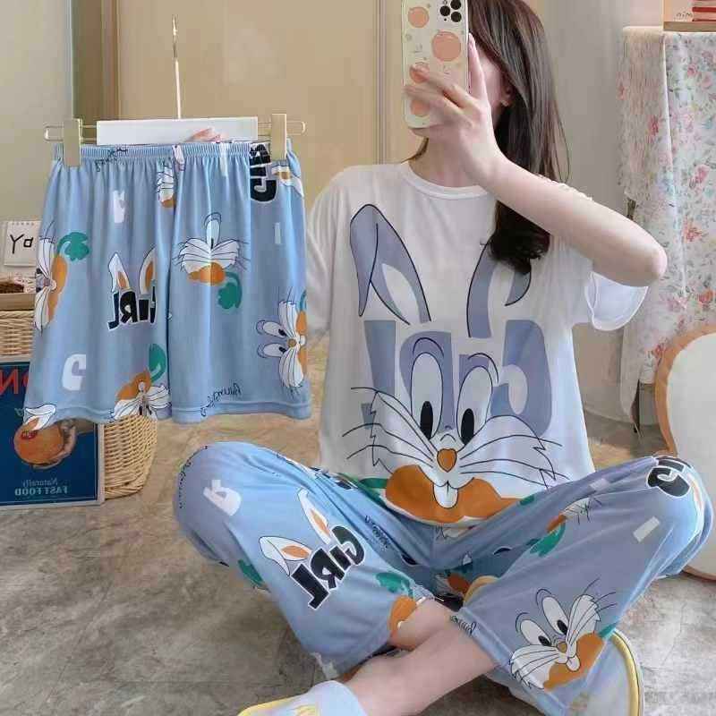ชุดนอนผู้หญิง 3 ชิ้น ชุดฤดูร้อน ผ้าบาง นุ่มสบาย ลายการ์ตูน เสื้อยืด กางเกงขาสั้น กางเกงขายาว ชุดลำลองใส่บ้าน ชุดนอน