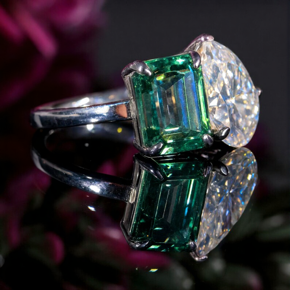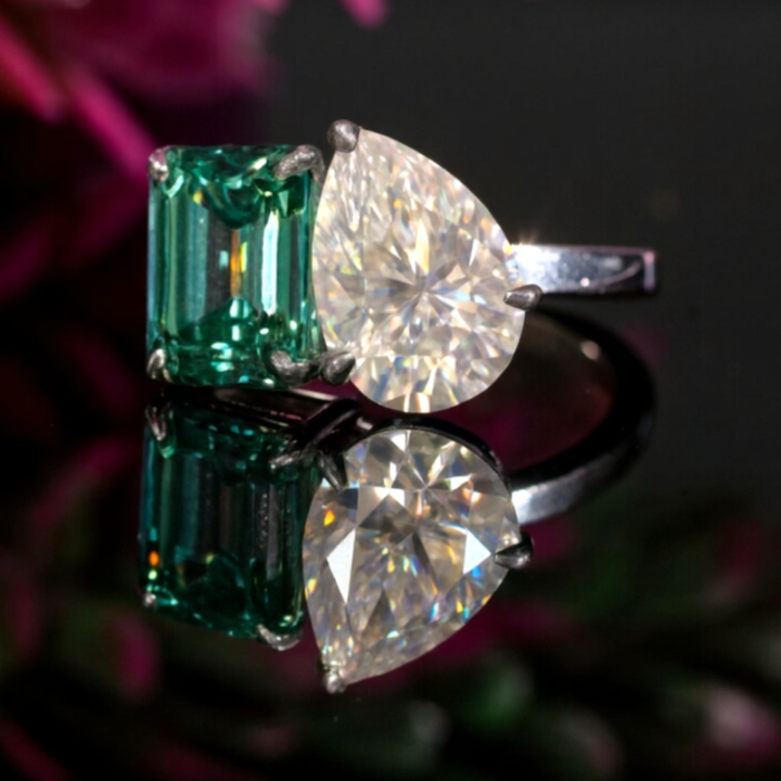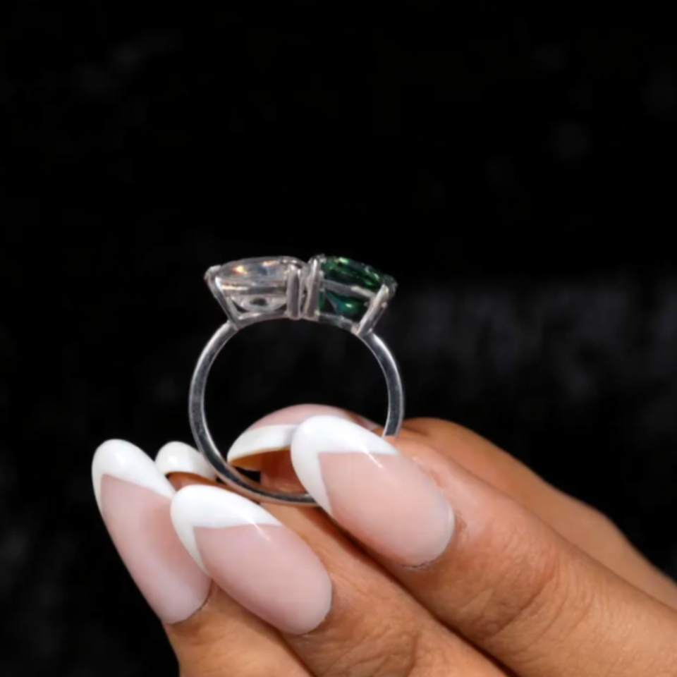 แหวนเพชรสองเม็ดทรงหยดน้ำสีเขียวมรกตขาว 3 กะรัต เพชรเลี้ยงในห้องปฏิบัติการ ความใส VS ทองคำขาว 14K เครื่องประดับสำหรับผู้หญิง