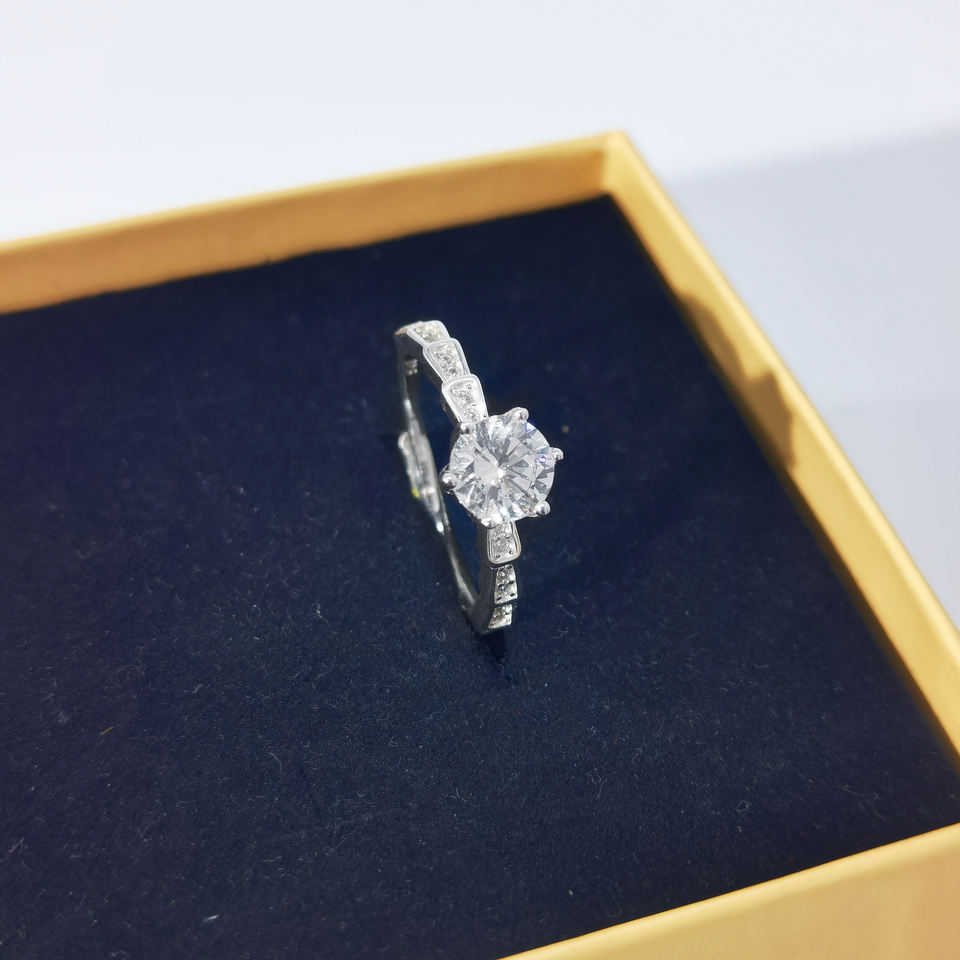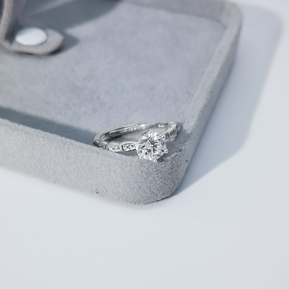 แหวนแต่งงานผู้หญิงชุบเงินแท้ 925 ชุบแพลตตินัม ดีไซน์ข้อต่อบамбู ประดับด้วยเพชรซิคอเนียเม็ดเล็กๆ ทุกส่วน