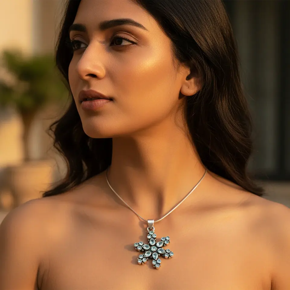 จี้รูปดอกไม้ประดับบลูโทแพซเงินแท้ 925 สำหรับผู้หญิง ประดับเพชรทรงเจ้าหญิง ชุบทองคำขาวและโรสโกลด์ พร้อมจี้ทองคำขาวและทองคำ