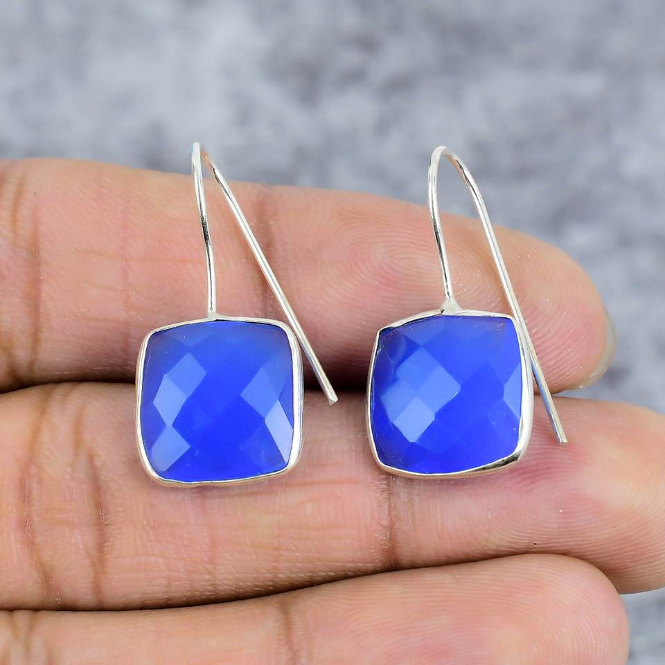 ต่างหูเงินสเตอร์ลิง925สำหรับผู้หญิงสีฟ้าและพลอยไข่มุกรูปทรงเบาะสำหรับเป็นของขวัญแต่งงาน