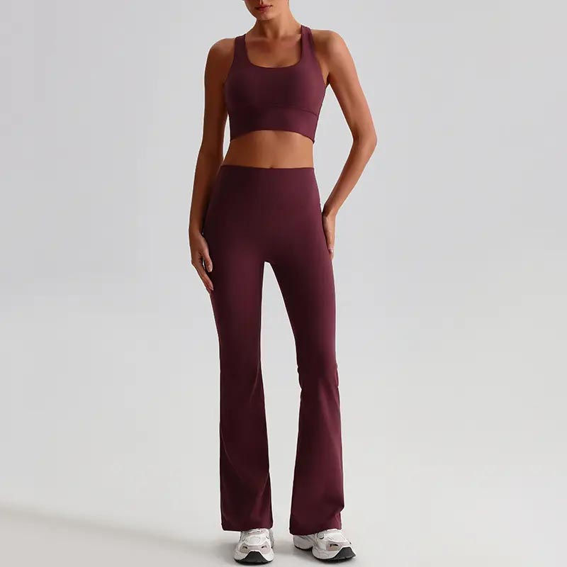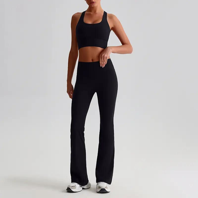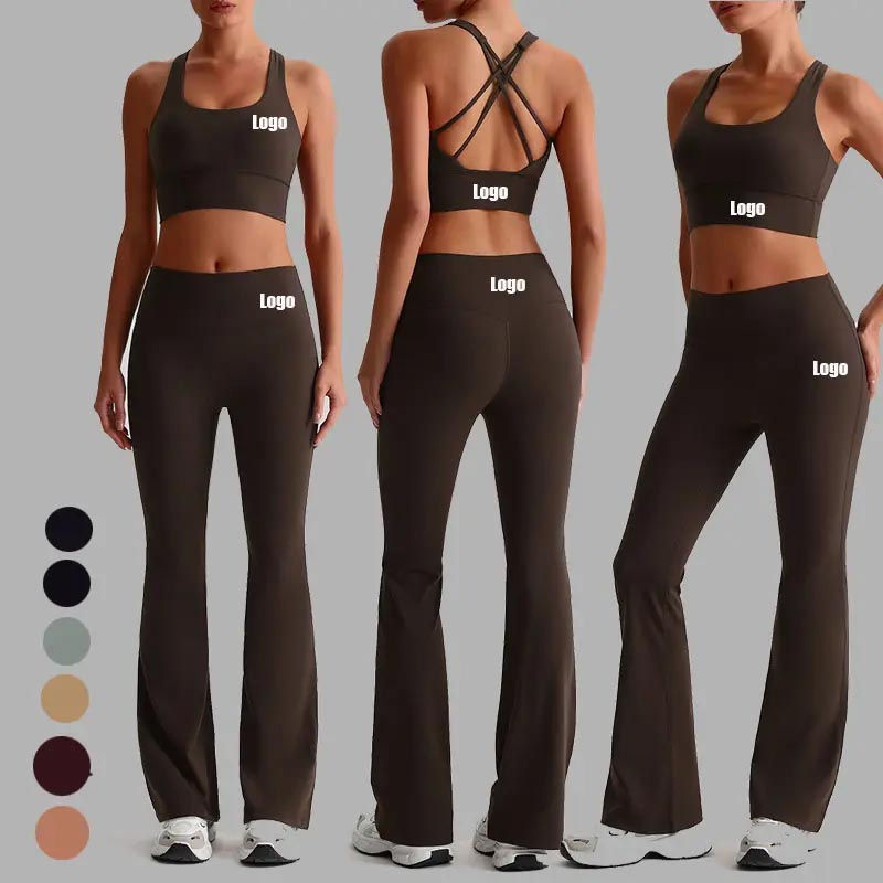 ชุดออกกำลังกายสำหรับผู้หญิง ชุดโยคะ ชุดฟิตเนส ลายเรียบแบบกำหนดเอง เสื้อชั้นในกีฬาและกางเกงขาบาน เอวยางยืด กางเกงเลกกิ้งสำหรับผู้หญิง