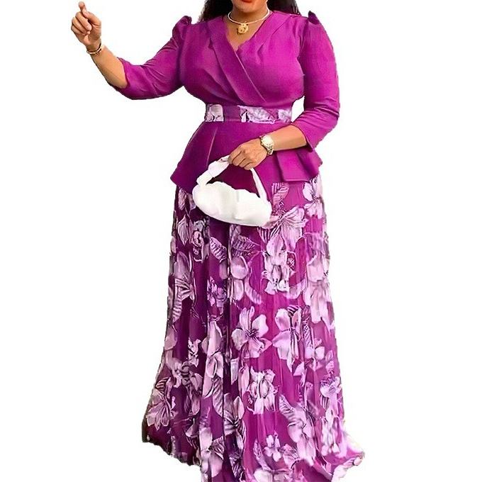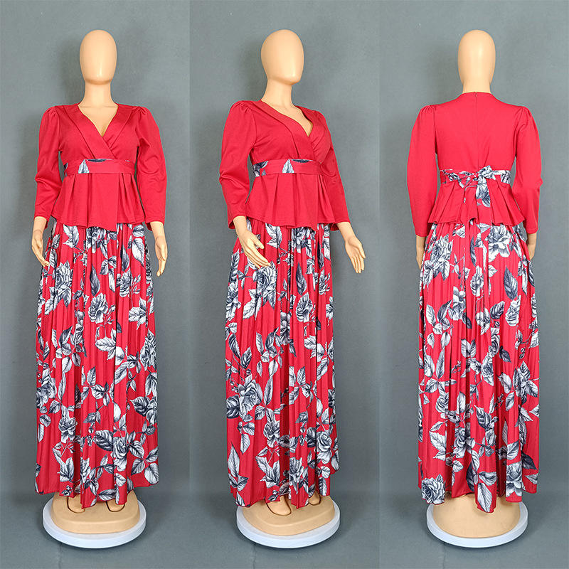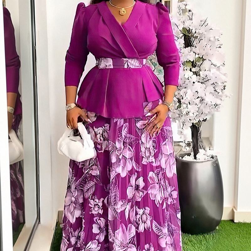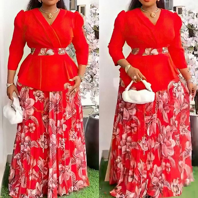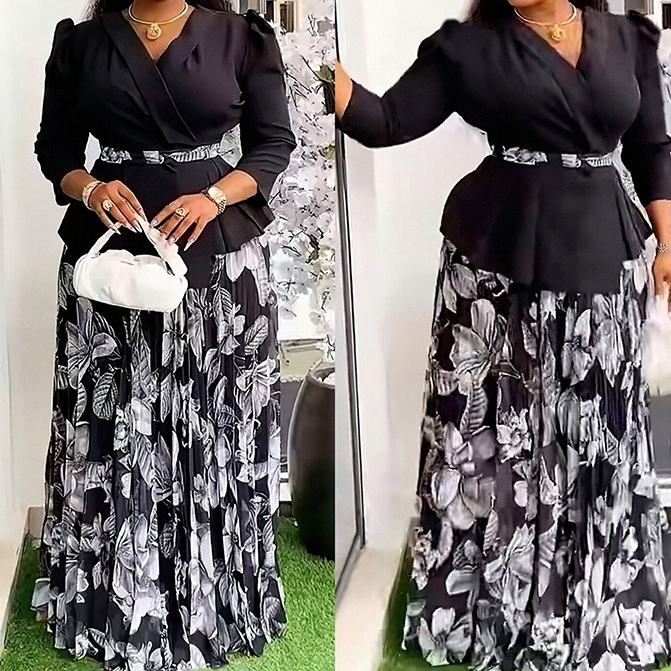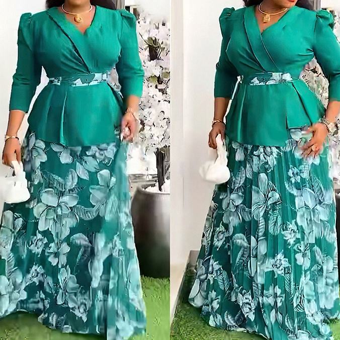 ชุดเซ็ต 2 ชิ้น เสื้อคอวีและกระโปรงจีบพลีทสำหรับผู้หญิงไซส์พลัสสไตล์แอฟริกัน