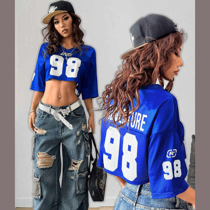 เสื้อเจอร์ซีย์อเมริกันฟุตบอลแขนยาวสำหรับผู้หญิง ทรงครอปท็อป สปอร์ต หมายเลขพิมพ์ลายตาข่าย เสื้อครอป Y2K 90s คอวี ลายกราฟิก สตรีทแวร์