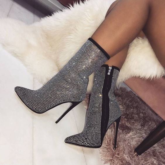 รองเท้าบูทข้อเท้าผู้หญิง ไซส์ใหญ่ 35-42 ประดับเพชร ส้นสูง ซิปหน้า ปลายแหลม เซ็กซี่ สไตล์มอเตอร์ไซค์ สำหรับผู้หญิง ปี 2025