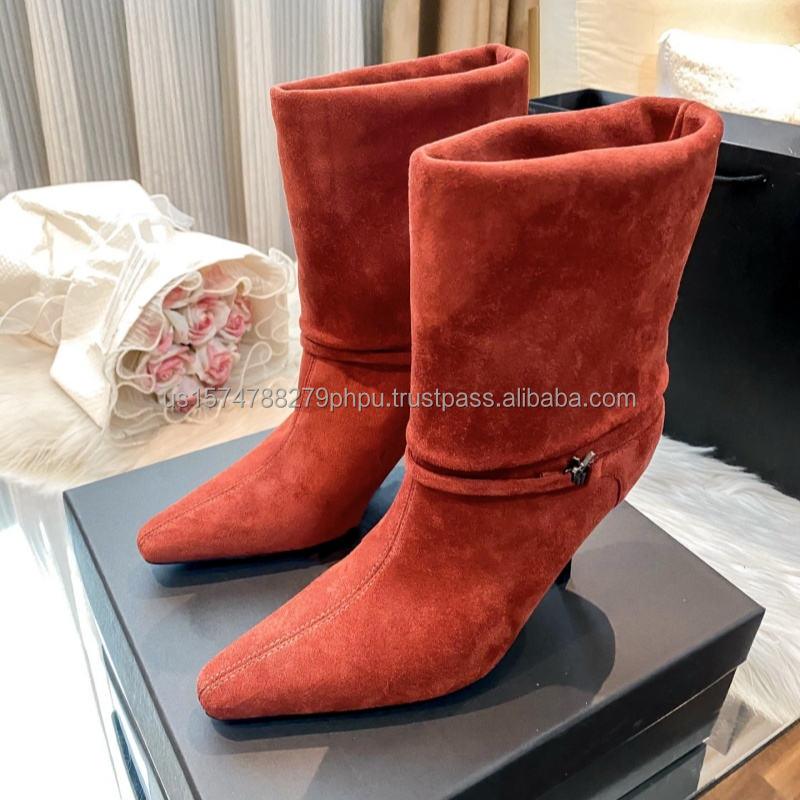 รองเท้าบูทหุ้มข้อส้นสูงหัวแหลมของผู้หญิงรองเท้าบูทสั้นสำหรับผู้หญิงรองเท้าบูทรองเท้าส้นเข็มนูนออกแบบได้ตามต้องการ
