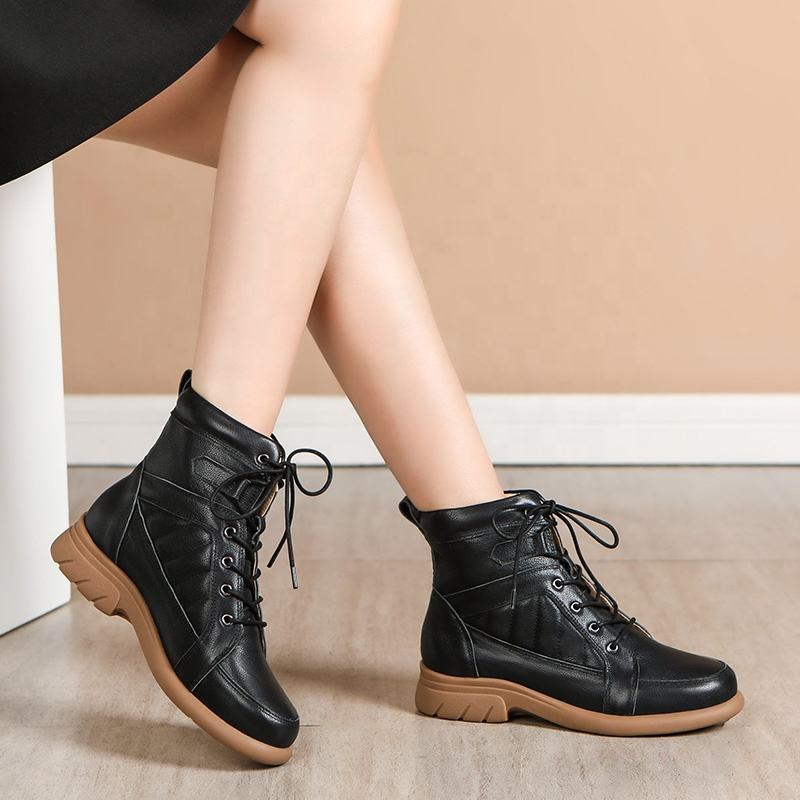 รองเท้าบูทข้อเท้าผู้หญิง สำหรับฤดูใบไม้ผลิ ฤดูใบไม้ร่วง ฤดูหนาว พื้นนุ่ม สวมใส่สบาย แบบลำลอง มีขน แต่งเชือกผูก ส้นหนา ทำจากหนังวัว