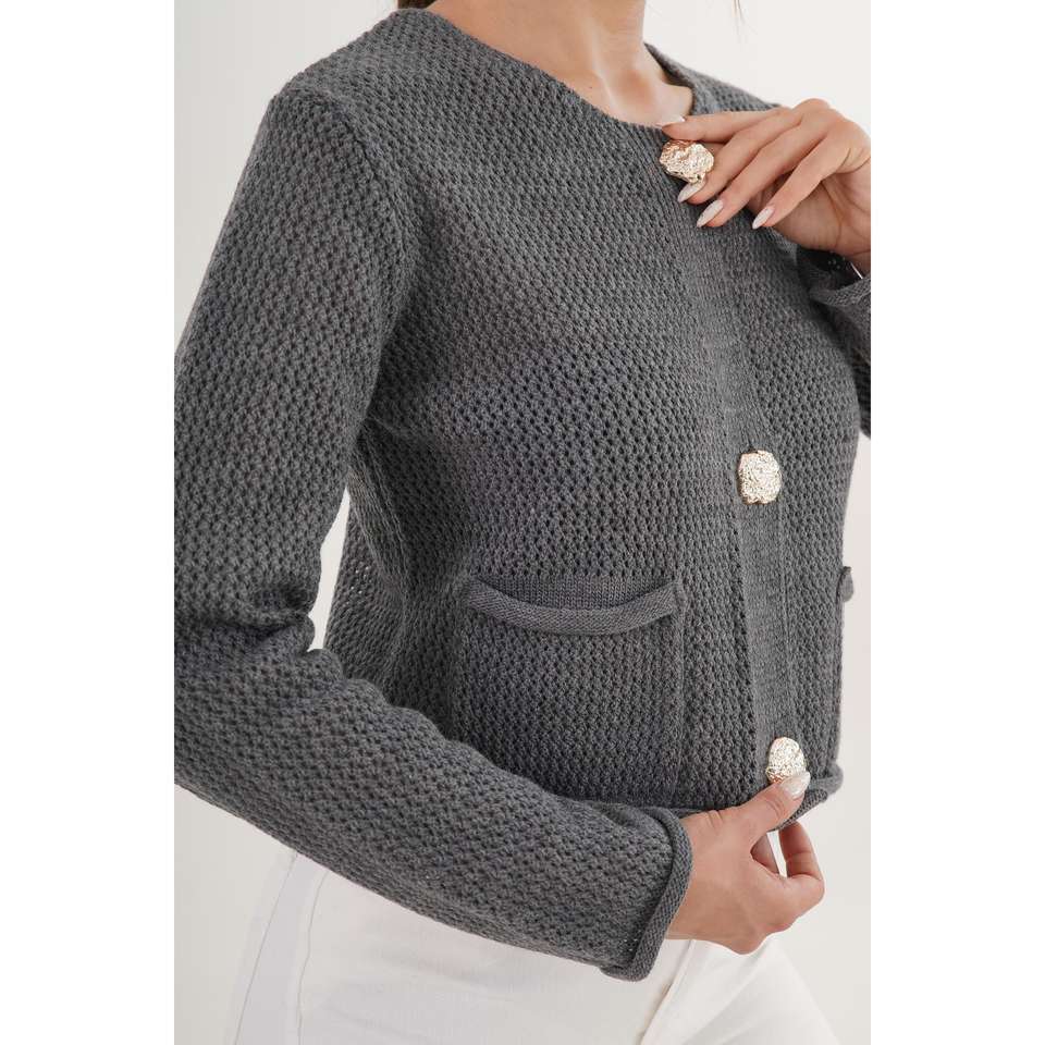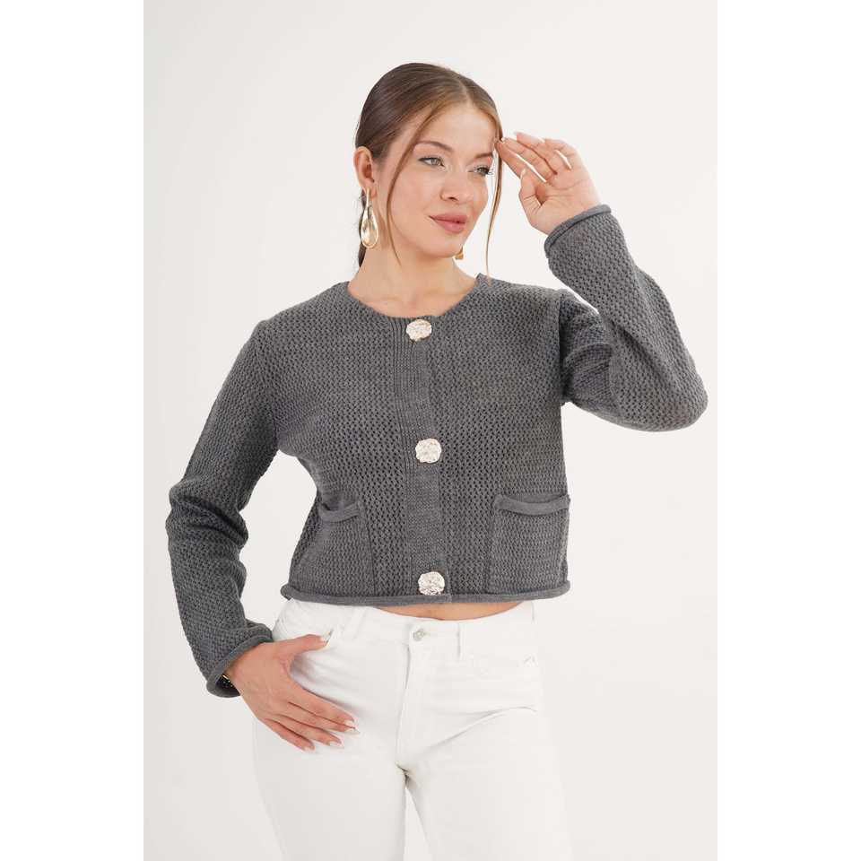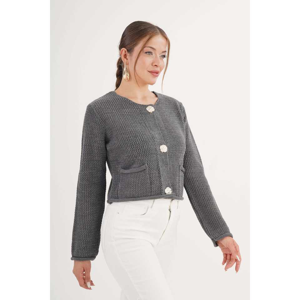 เสื้อคลุมคาร์ดิแกนสีแอนทราไซต์สำหรับผู้หญิง พร้อมกระดุมประดับอัญมณี ขายส่งเครื่องประดับแฟชั่น