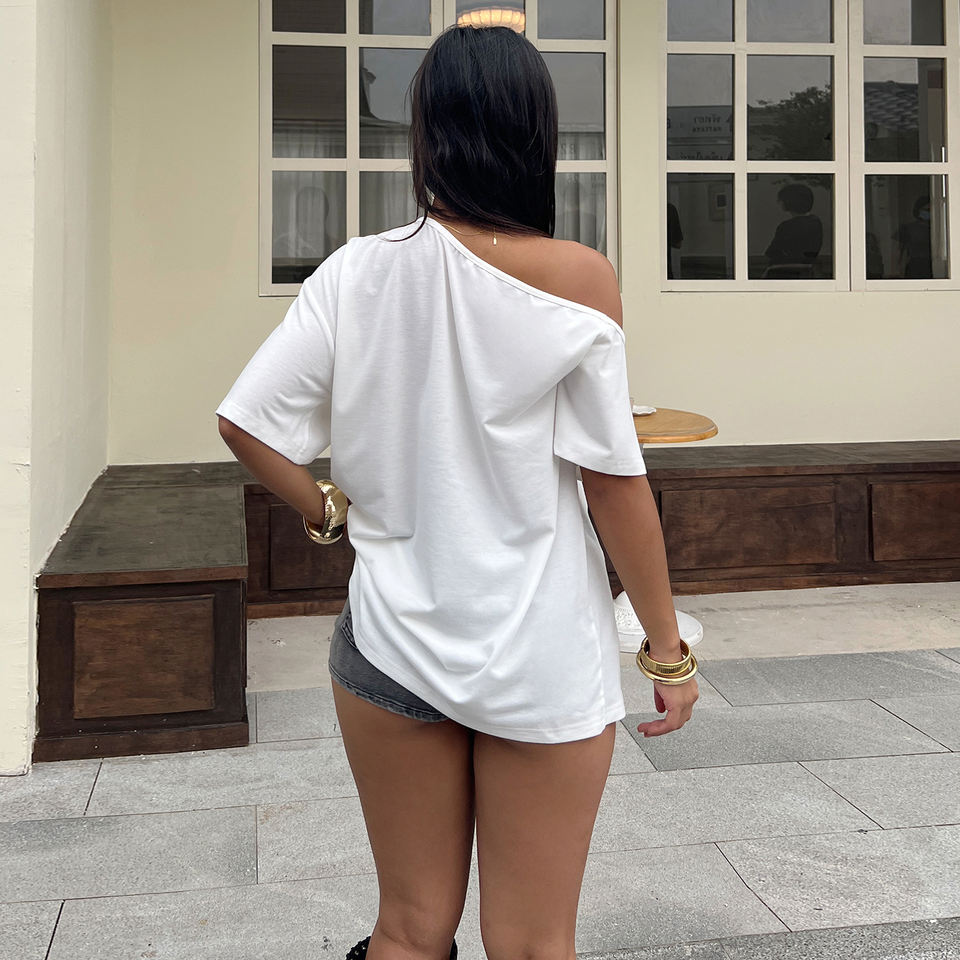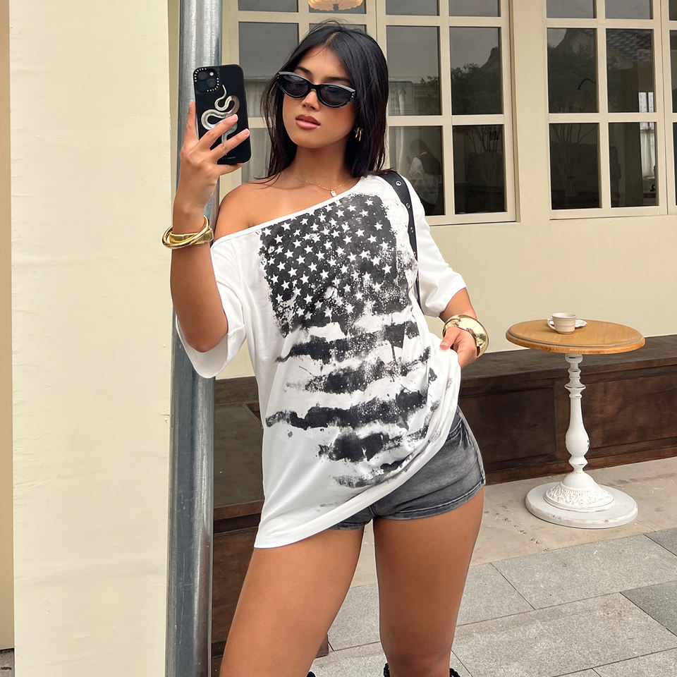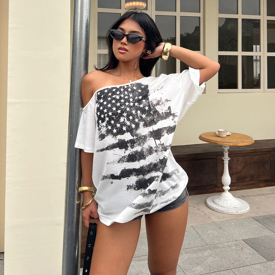 เสื้อยืดผู้หญิงแบบไหล่เฉียงพิมพ์ลายธงชาติอเมริกา สไตล์วินเทจทรงโอเวอร์ไซส์แนวสตรีทฮิปฮอป