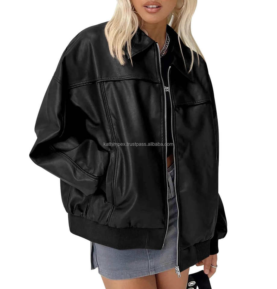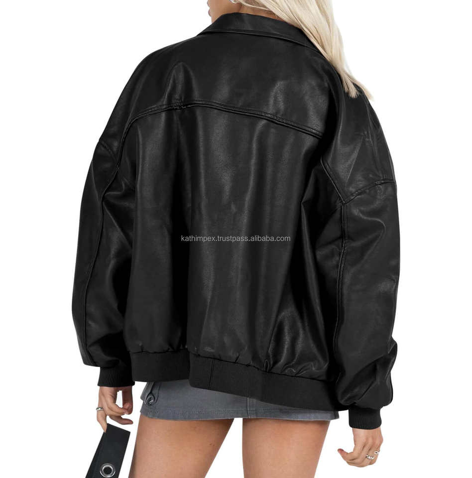 เสื้อแจ็คเก็ตหนังทรงบอมเบอร์สำหรับผู้หญิง แฟชั่นฤดูใบไม้ร่วง สไตล์ลำลอง ทรงโอเวอร์ไซส์ สีดำน้ำตาล ซิปหน้า เสื้อคลุมฤดูหนาว ระบายอากาศได้ดี ซับในวิสโคส ไซส์พลัส