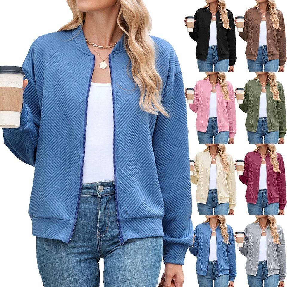 เสื้อเบสบอลผู้หญิง แขนยาว คอโอ ทรงหลวม สีพื้น ผ้าถักนุ่ม โพลีเอสเตอร์ สำหรับฤดูใบไม้ร่วงและฤดูหนาว รุ่นใหม่ ปิดด้วยซิป